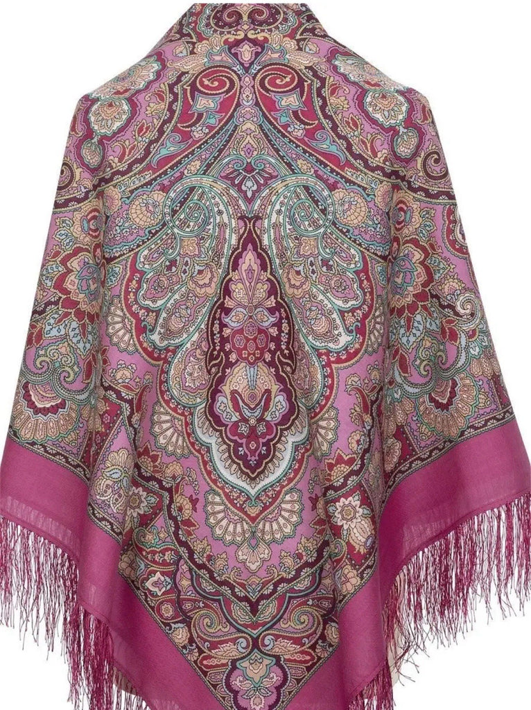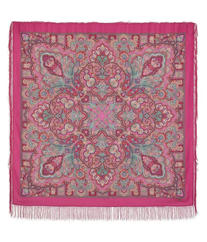 This 57'' big square shawl is made of 100% merino wool in a bohemian raspberry pink color, perfect for adding a stylish touch to any outfit. This soft and warm shawl features herbal pattern accents with fringe details, making it a versatile piece that can be worn year-round. Created by the brand Pavlovo Posad in the Russian Federation, this cozy woolen pink shawl is ideal for those looking for a unique and multifunctional accessory to add to their wardrobe. Crafted from
