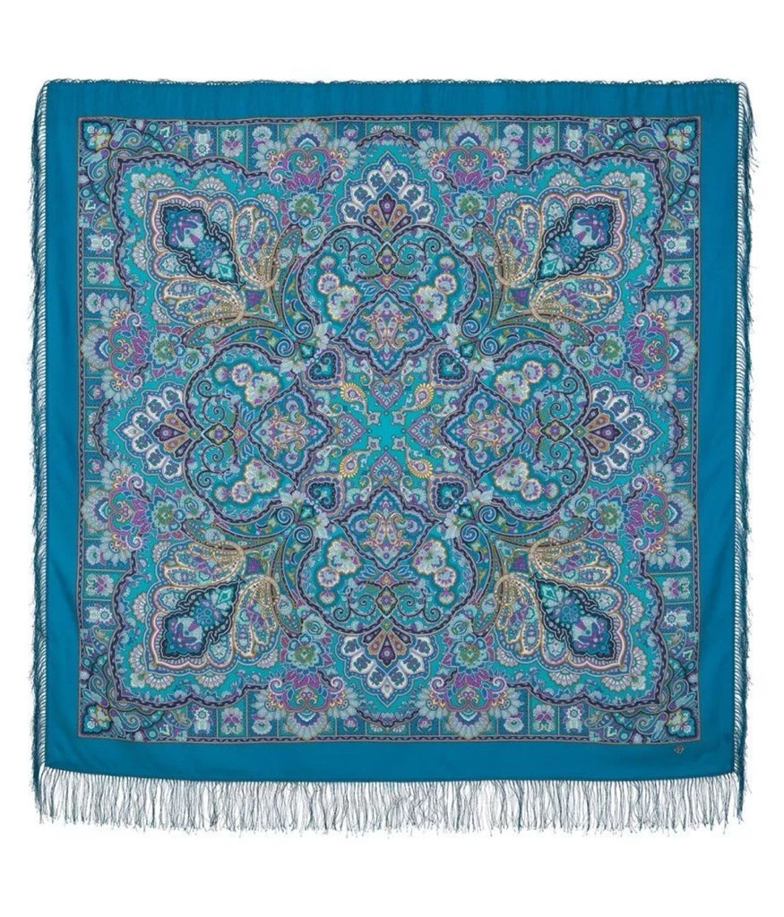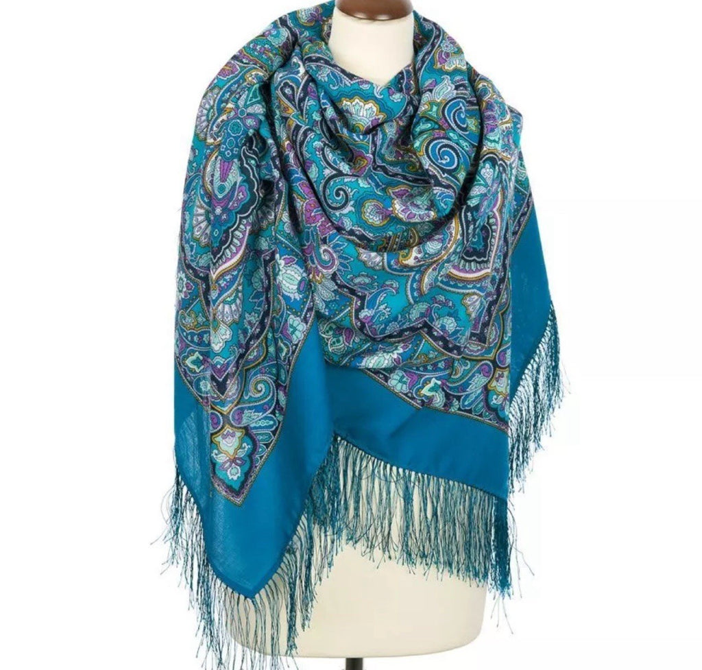 This 57'' big square shawl in dark turquoise is made from 100% merino wool, featuring a herbal pattern and Bohemian character. The shawl is adorned with fringe accents and is versatile to be worn as a scarf, palantine, neck warmer, dupatta, or shoulder wrap. With colors of dark turquoise, turquoise, yellow, and purple, this shawl from Pavlovo Posad is a stylish and functional addition to any wardrobe, suitable for all seasons.