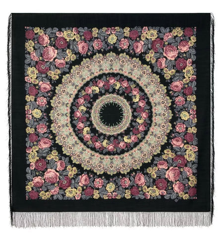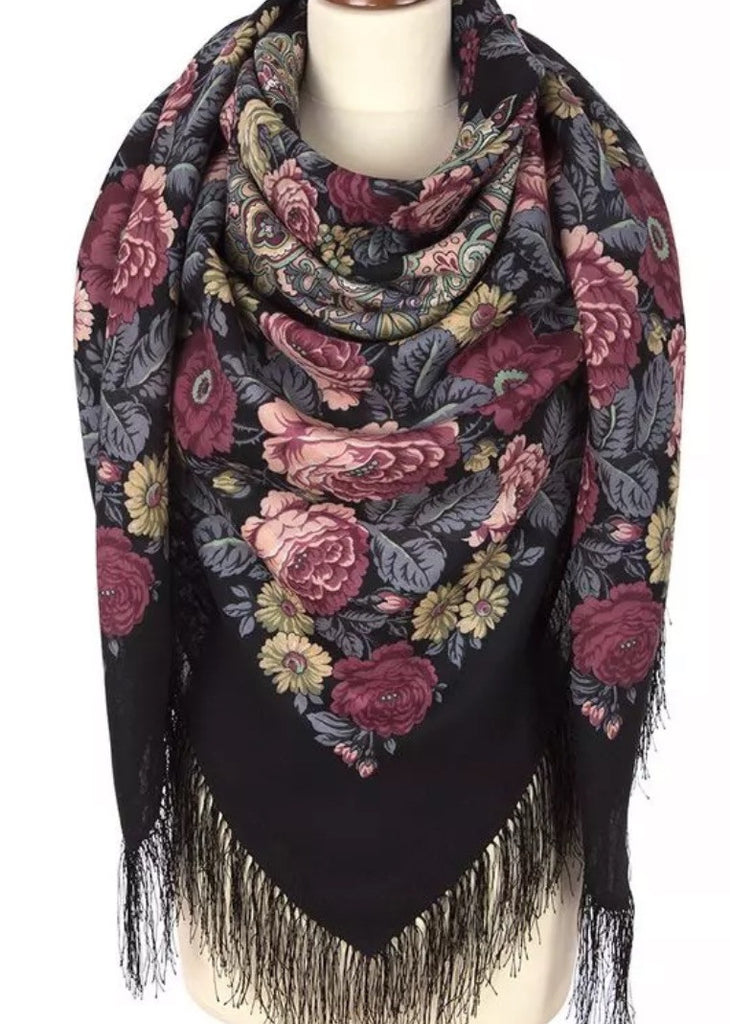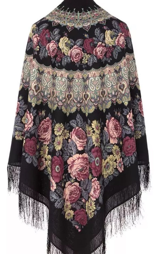 This 57'' square large black scarf by Pavlovo Posad famous Russian brand features a floral pattern with vintage style roses in pink and burgundy colors. Made from 100% Merino wool, this wrapping scarf is adorned with fringe accents, making it a stylish accessory for women. Versatile in style, it can be worn as a wrap, shawl, head scarf, neck warmer, or stole, suitable for various seasons including winter, summer, fall, and spring. The women boho scarf titled "Molitva 353-20" is crafted in the Russian Federation, adding a touch of traditional elegance to any outfit. Perfect for gifting.