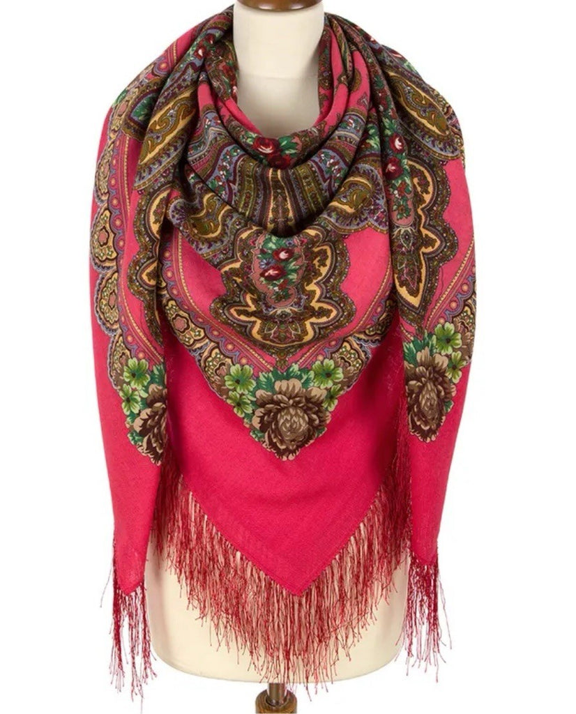 Wrap yourself in the warmth and elegance of this 57'' large Russian scarf from Pavlovo Posad, a testament to timeless style and comfort. Crafted from 100% merino wool, this pink wrapping shawl is a versatile accessory that promises to elevate any outfit. Its floral pattern with herbal accents offers a touch of bohemian charm, perfect for those who appreciate a unique blend of traditional motifs with contemporary fashion.