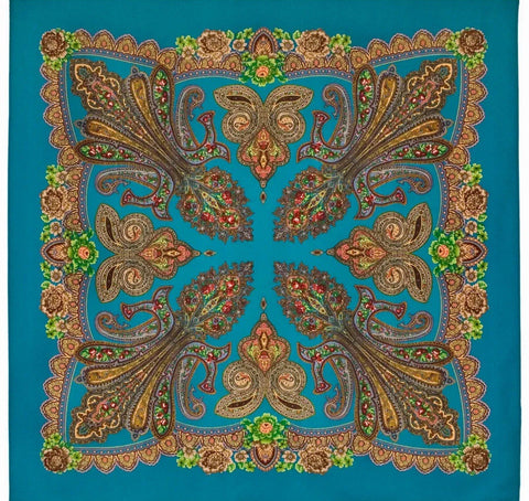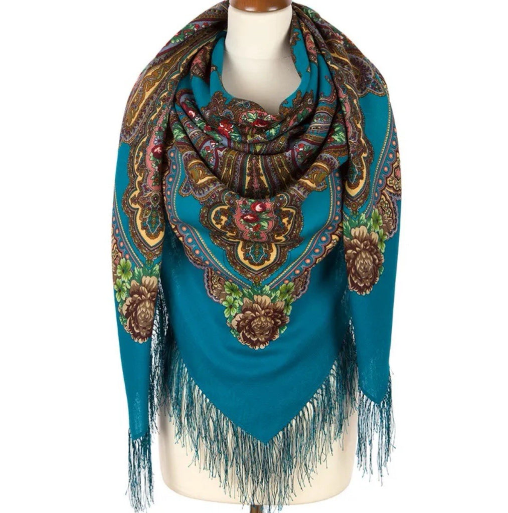 Wrap yourself in the warmth and elegance of this 57'' large Russian scarf from Pavlovo Posad, a testament to timeless style and comfort. Crafted from 100% merino wool, this sea green shawl is a versatile accessory that promises to elevate any outfit. Its floral pattern with herbal accents offers a touch of bohemian charm, perfect for those who appreciate a unique blend of traditional motifs with contemporary fashion.