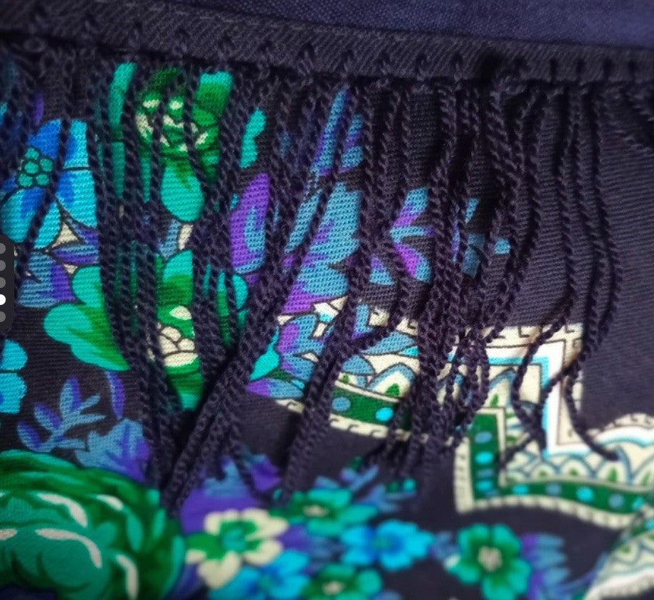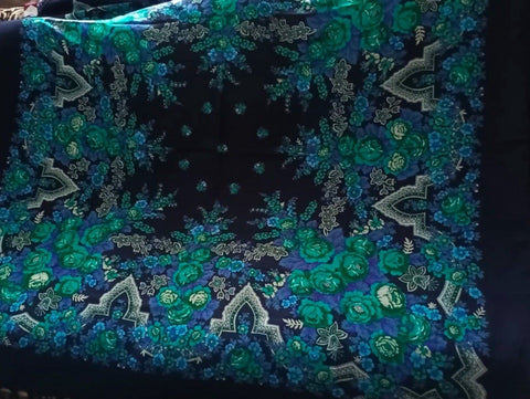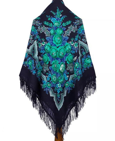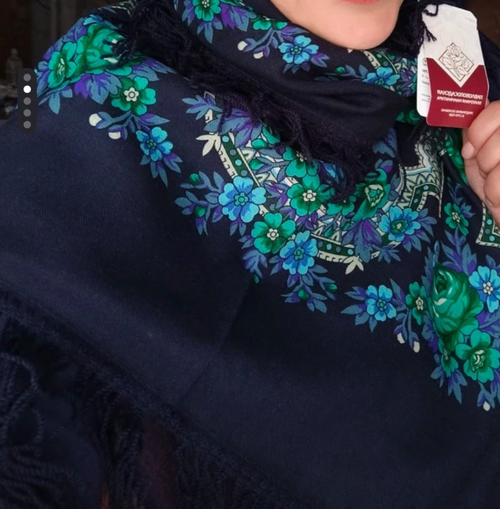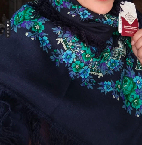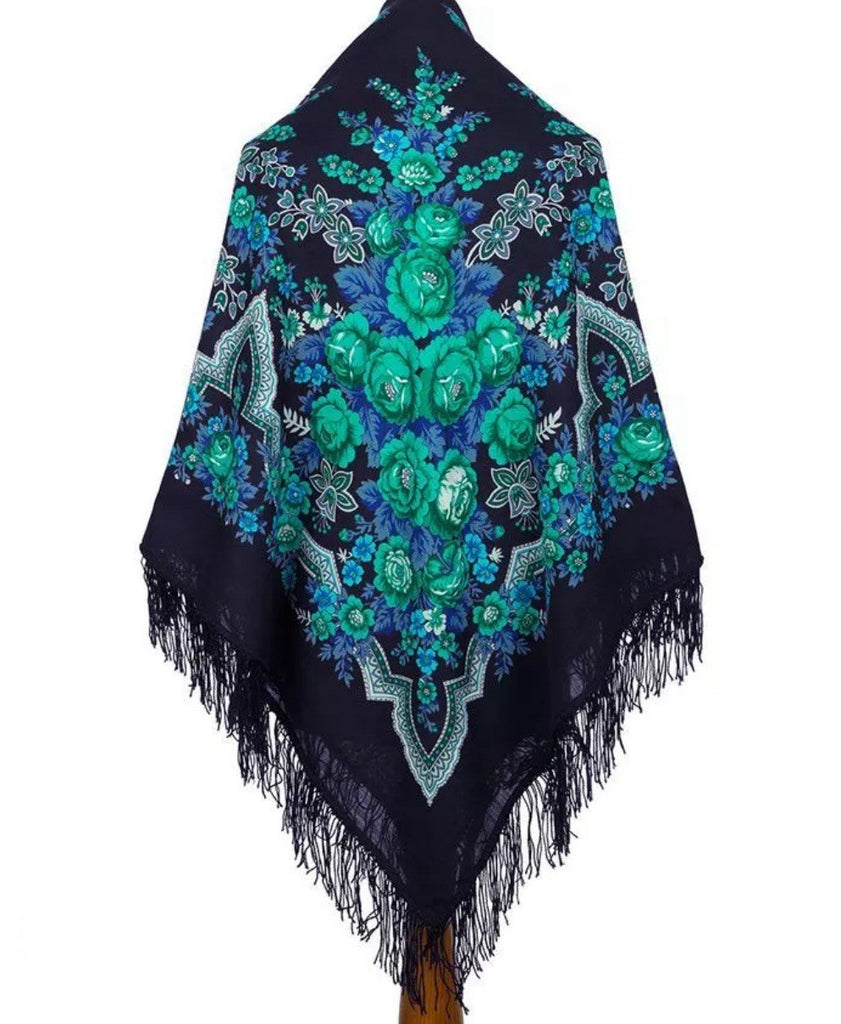 This 57'' Russian fall big warm scarf is crafted from 100% merino wool in a mix of navy blue, mint, white, and light blue colors, featuring a floral pattern and woolen fringe accents. Handmade by the brand Pavlovo Posad in the Russian Federation, this traditional versatile scarf can be worn as a shawl, palantine, neck warmer, or even as a hijab. Its bohemian style and multifunctional design make it perfect for all seasons, adding a touch of bohemian flair to any outfit.