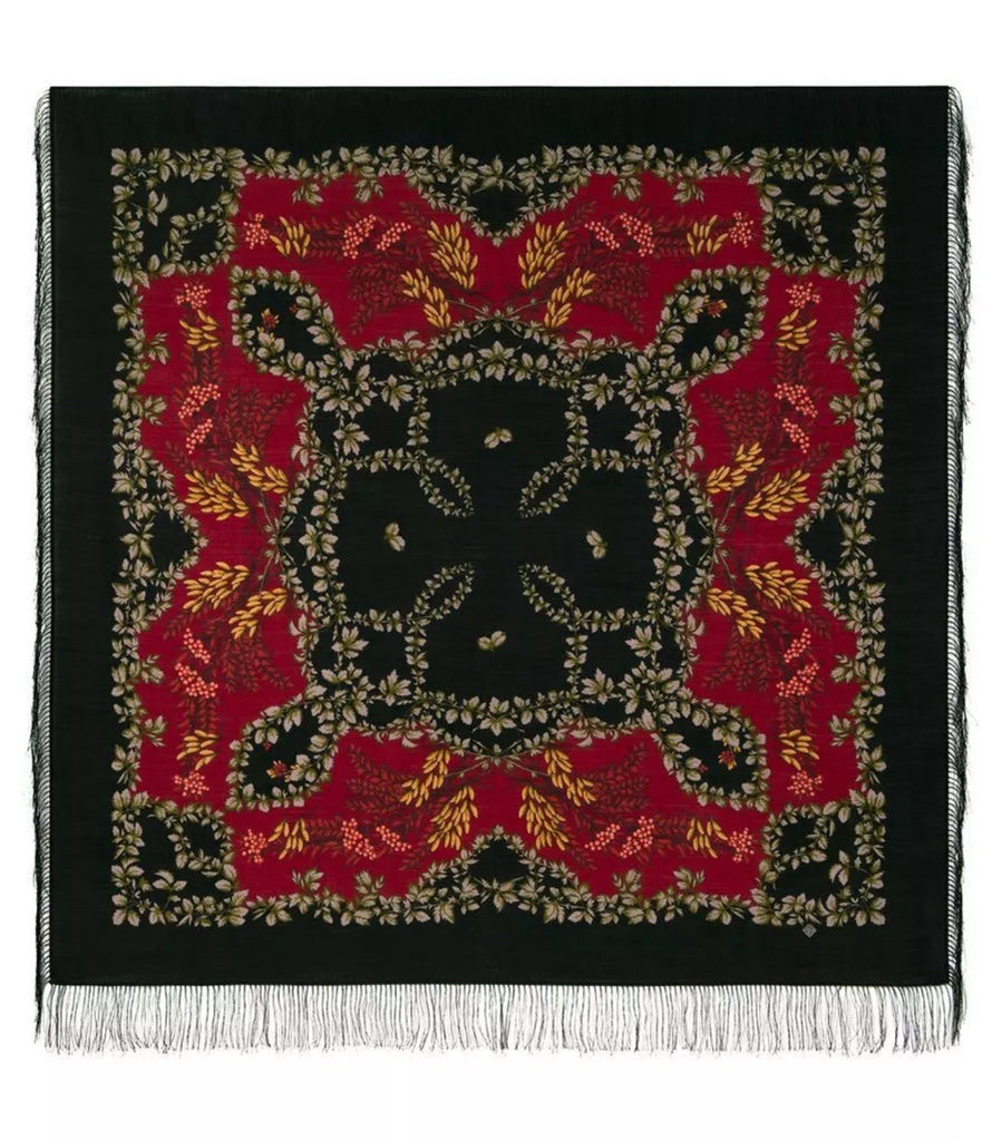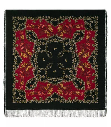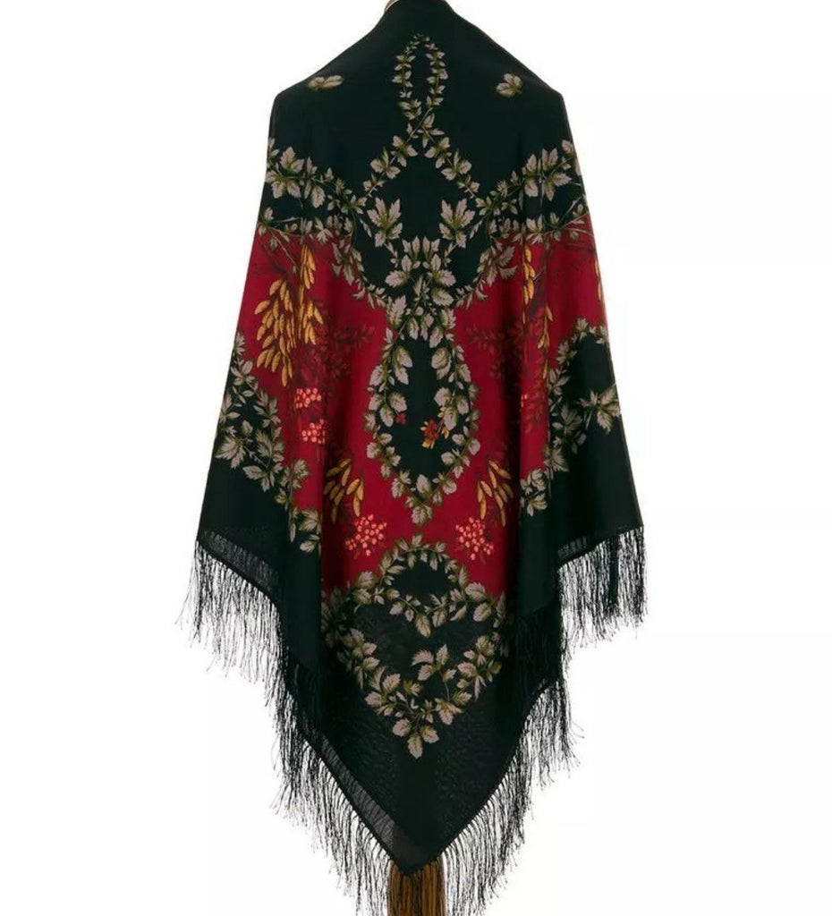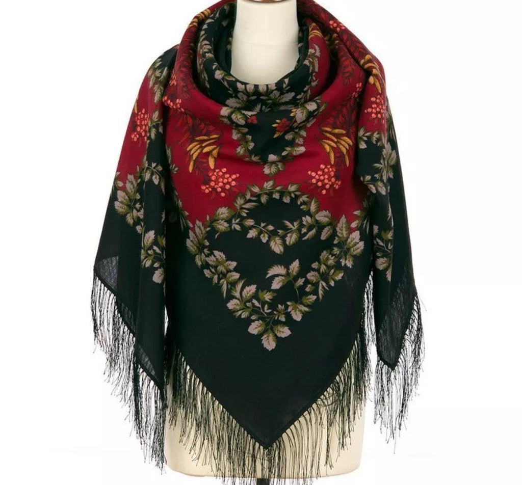 This 57'' black and red shawl is a luxurious and versatile accessory made from 100% merino wool. The intricate floral pattern featuring rowan, leaves, and flowers adds a touch of bohemian style to any outfit. The scarf is perfect for adding a pop of color to your winter wardrobe, but can also be worn in other seasons for a stylish and cozy look. Its multifunctional design makes it a must-have accessory for any fashion-forward woman. Made in the Russian Federation by Pavlovo Posad, this shawl is a timeless piece that will elevate your wardrobe. This Russian beautiful scarf is not only soft but also made of 100% natural wool. A perfect gift idea for the women in your life, especially for adult family members like grandmothers, mothers, and mothers-in-law. The dark tones give it a sophisticated touch.