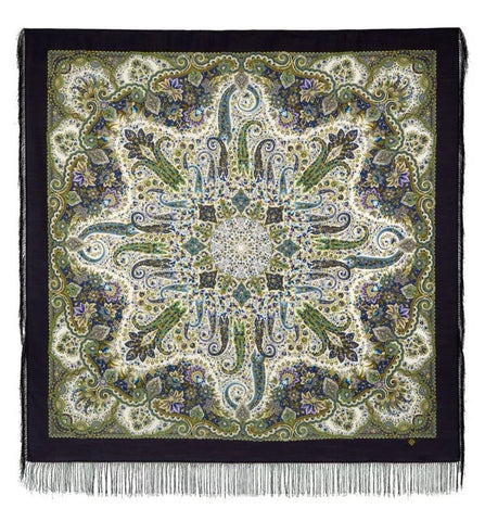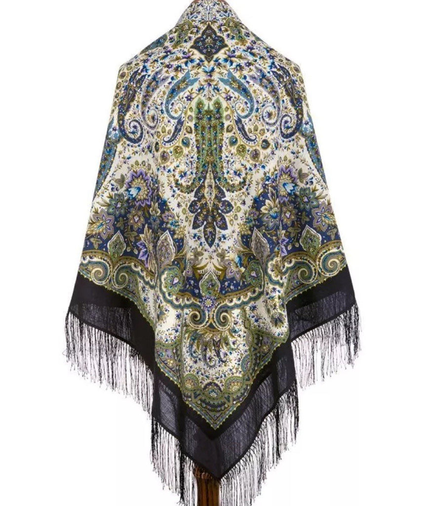 This 57'' shawl in navy blue, green, purple, turquoise and pale yellow with floral patterns is a versatile accessory made from 100% merino wool. Featuring intricate leaves and flowers, this soft scarf is perfect for adding a touch of bohemian style to any outfit. With silky fringe accents and a square style, it can be styled as a shawl, palantine, neck warmer, or even a hijab. Made in the Russian Federation by Pavlovo Posad, this wrapping scarf is a must-have for any fashion-forward woman looking to stay warm and stylish in all seasons. This traditional