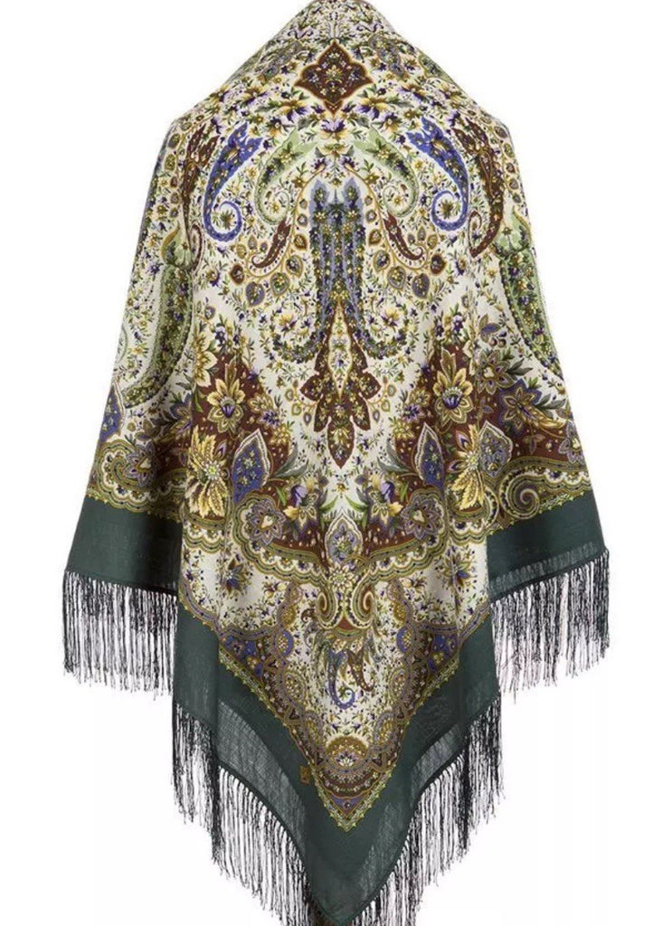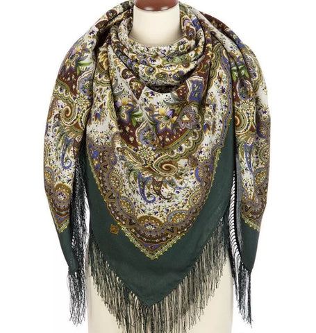 This 57'' wrapping shawl green beige scarf by Pavlovo Posad features a beautiful floral pattern with leaves and flowers, perfect for adding a touch of bohemian style to any outfit. Made from 100% merino wool, this scarf is not only stylish but also versatile, serving as a neck warmer, shoulder wrap, or hijab. The greyish green, brown, beige, and blue colors give it a unique and eye-catching look, while the fringe accents add a trendy touch. Whether worn in winter, summer, fall, or spring, this scarf is sure to become a staple in any woman's wardrobe. These Russian