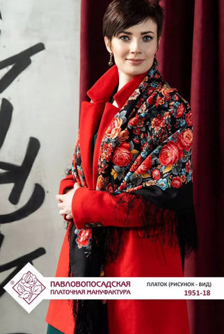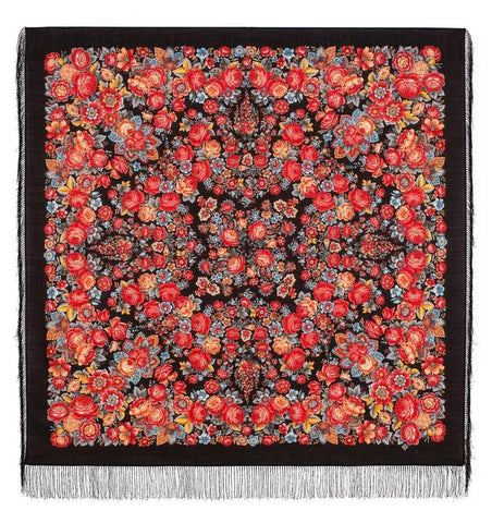 from the craftsmen of the Pavlovo Posad manufactory - a black woolen scarf with large red roses that