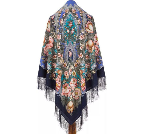 This 57'' square scarf by Pavlovo Posad is made of 100% Merino wool in a beautiful Blue, Peach, Gray, and Turquoise color palette. The scarf features a floral pattern with leaves and flowers, making it a perfect accessory for nature lovers. With fringe accents, this versatile scarf can be styled in various ways such as a shawl, head scarf, neck warmer, or stole, making it a must-have for any season.
