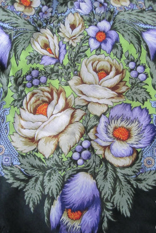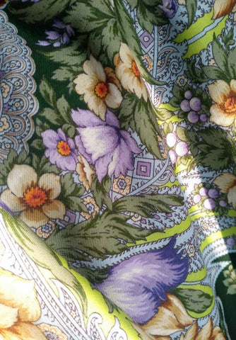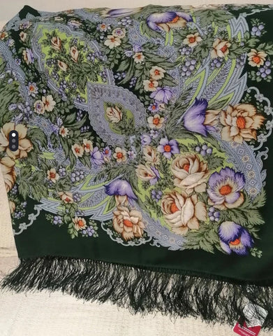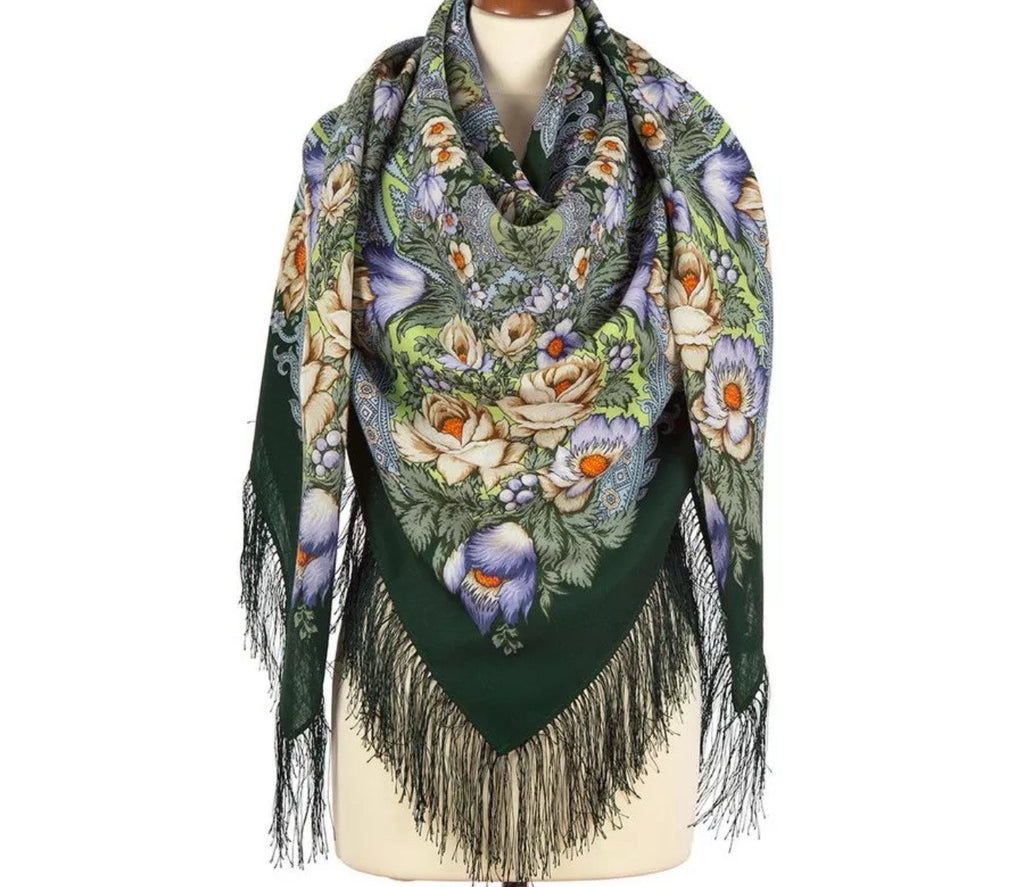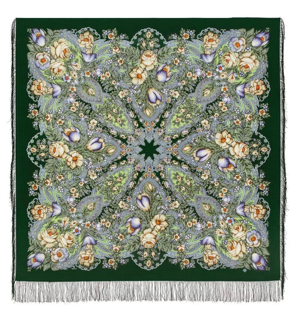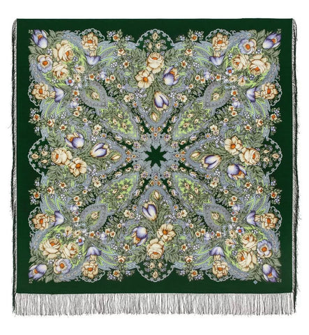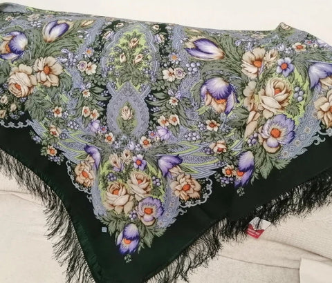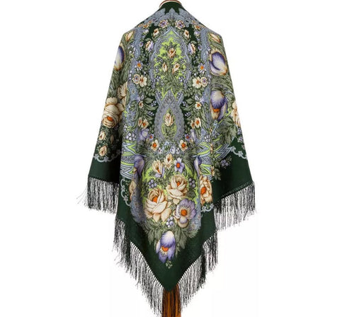 This 57'' square very large scarf is crafted from 100% merino wool in dark green, salad green, purple, and gray colors. The cozy and soft wrapping scarf features a floral pattern with leaves and flowers, making it a nature-themed accessory. It is adorned with fringe accents and is designed to be worn in multiple ways, such as a wrap, shawl, head scarf, neck warmer, hijab, or stole. The warm scarf, titled "Pesnya Skazochnogo Lesa 1880-5," is a stylish and versatile piece suitable for all seasons, including winter, summer, fall, and spring. Made by the brand Pavlovo Posad in the Russian Federation, this Russian traditional folk scarf is a luxurious addition to any woman's wardrobe.