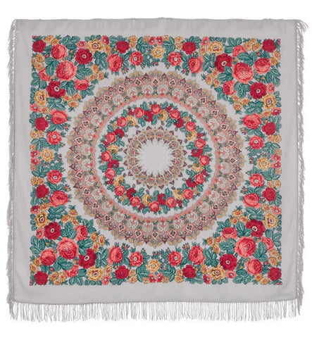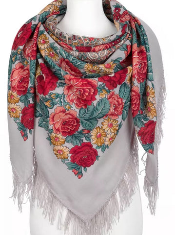 This women's square scarf by famous Pavlovo Posad brand features a floral pattern with leaves and flowers in shades of gray, red, mint, green, beige, and pink. Made of 100% merino wool, the scarf is designed for various uses such as a wrap, shawl, head scarf, neck warmer, hijab, or stole. With a fringe accent, this scarf titled "Molitva 353-1" is a versatile accessory suitable for winter, summer, fall, and spring, crafted in the Russian Federation.