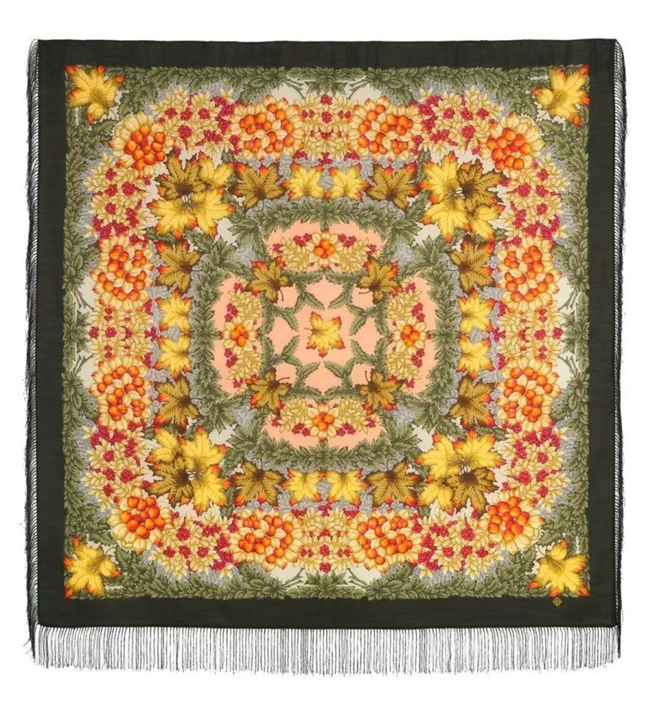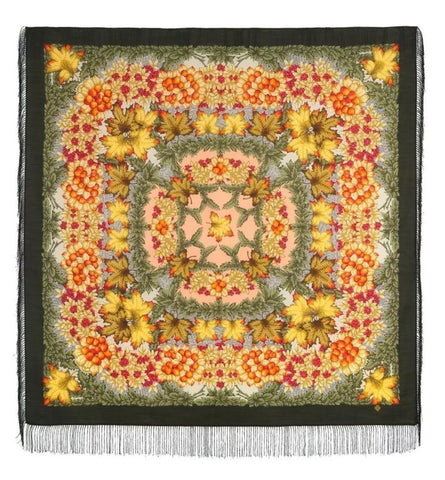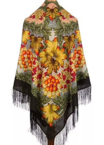 Indulge in luxury with our high-quality 100% merino wool square scarf in dark green. Measuring 57 inches, this cozy and soft scarf features fall-themed patterns of falling yellow leaves, red fruits harvest, and multicolor flowers. Expertly crafted with natural merino wool for delicate and comfortable wear, it's the perfect gift for any woman. Get the best of both worlds with our high quality square scarf! Made from natural merino wool, our scarf offers affordable luxury. Enjoy the natural benefits of merino wool, including softness, warmth, and durability, all at a great price. Elevate your style with our must-have vintage inspired Slavic accessory.