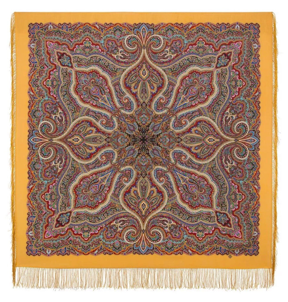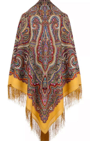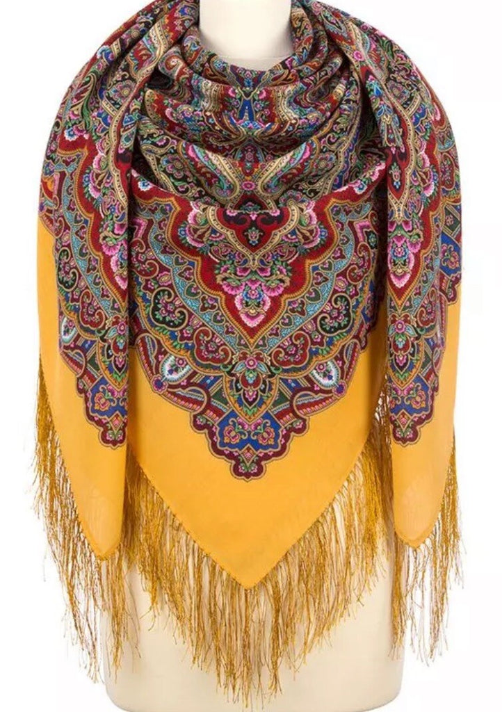 Indulge in luxury with our high-quality 100% merino wool square scarf in yellow, pink, red and blue. Measuring 57 inches, this cozy and soft scarf features traditional ornaments and multicolor ornaments. Expertly crafted with natural merino wool for delicate and comfortable wear, it's the perfect gift for any woman. Get the best of both worlds with our high quality square scarf! Made from natural merino wool, our scarf offers affordable luxury. Enjoy the natural benefits of merino wool, including softness, warmth, and durability, all at a great price. Elevate your style with our must-have vintage inspired Slavic accessory.