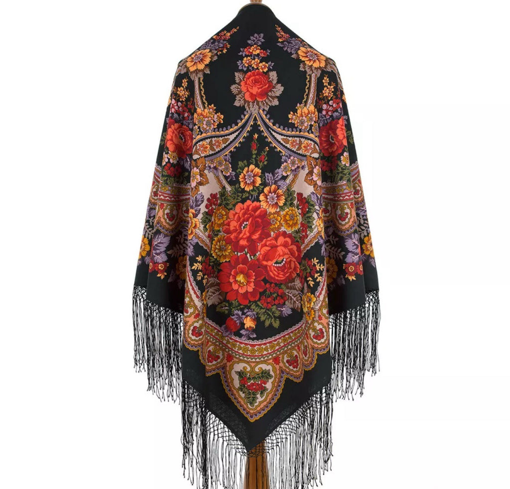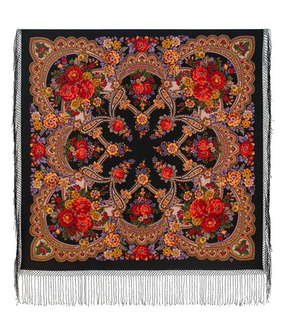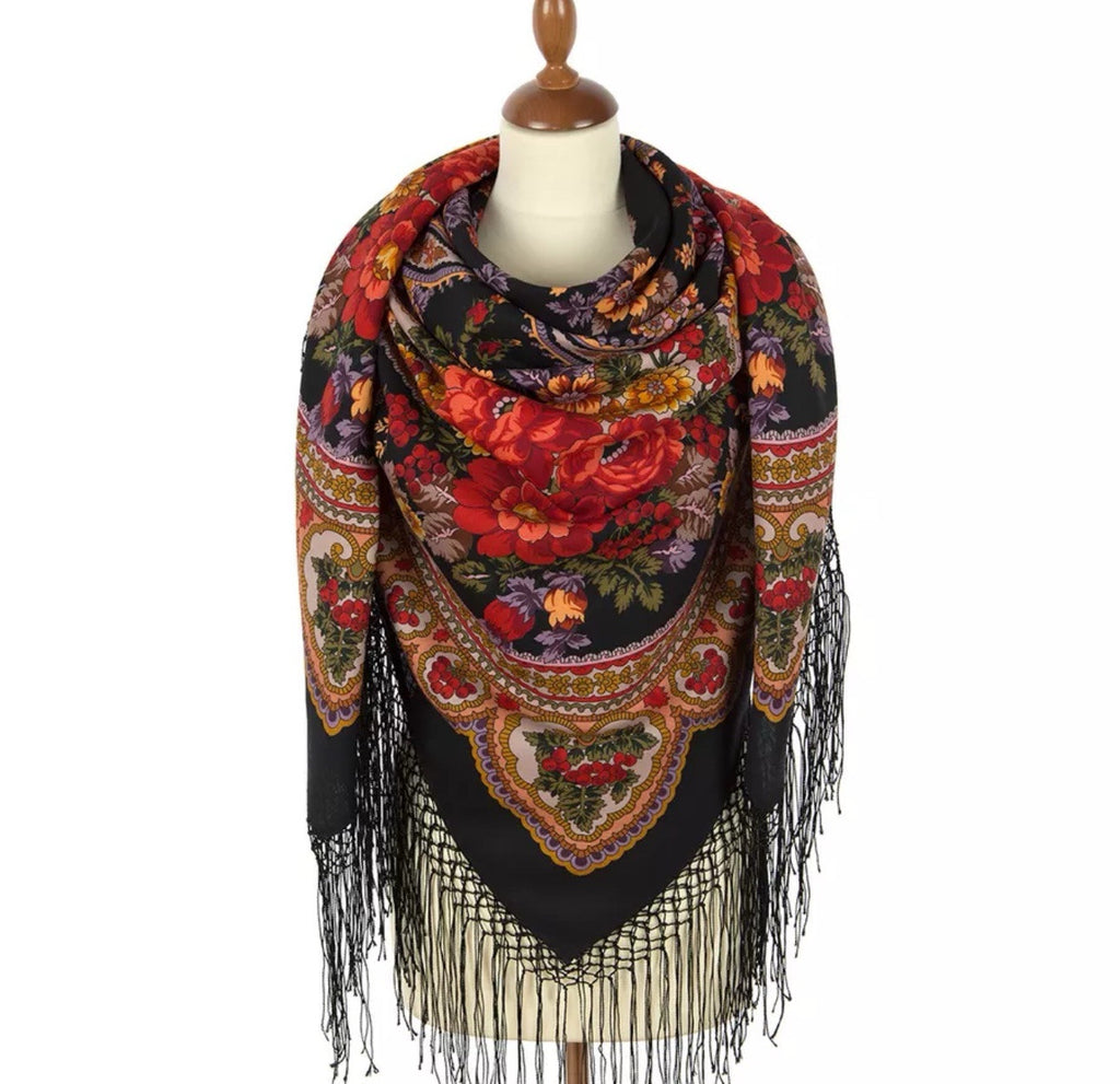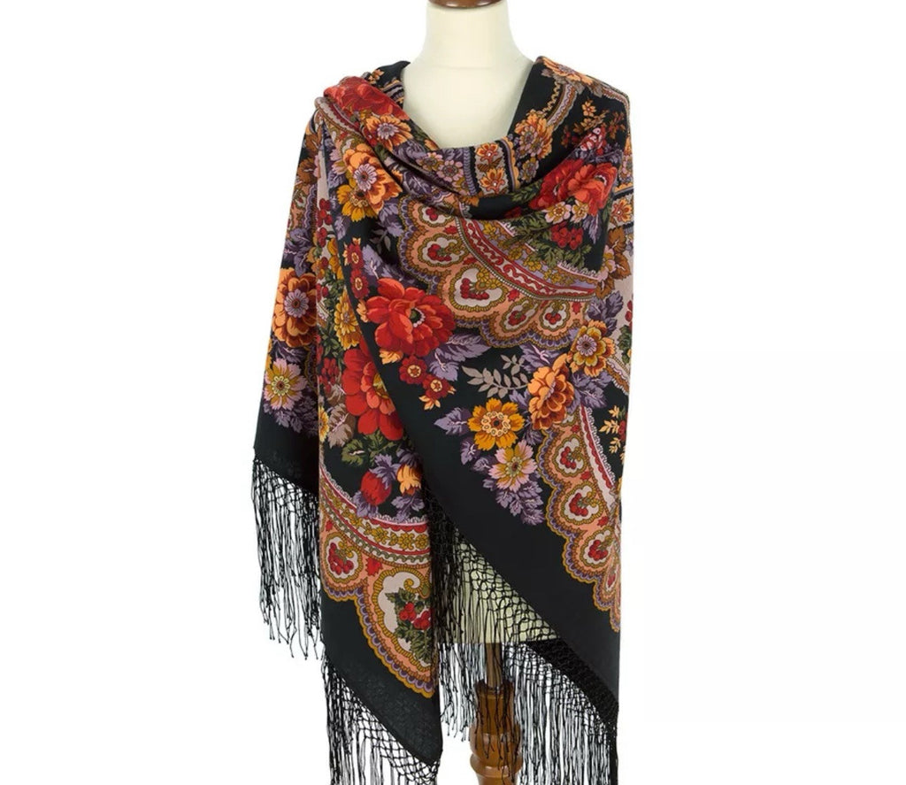 Wrap yourself in the warmth and elegance of the Pavlovo Posad 58'' square scarf, a versatile addition to any wardrobe. Crafted from luxurious merino wool, this scarf boasts a vibrant palette of black, red, orange, pink, and olive green, adorned with a floral pattern that captures the essence of nature's beauty. Its silky fringed accents add a touch of sophistication, making it a standout accessory for any outfit.