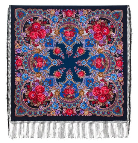 This Pavlovo Posad scarf is a 58'' big square made of navy blue merino wool, featuring a floral pattern with red and pink flowers. The design includes leaves and flowers, with accents of silky fringe. The scarf, titled "Vremena goda. osen 708-14," is versatile and can be worn as a shawl, wrap, neck warmer, or stole. Made in the Russian Federation, this soft scarf is suitable for all seasons and would be a stylish addition to any woman's wardrobe. Stay warm and stylish