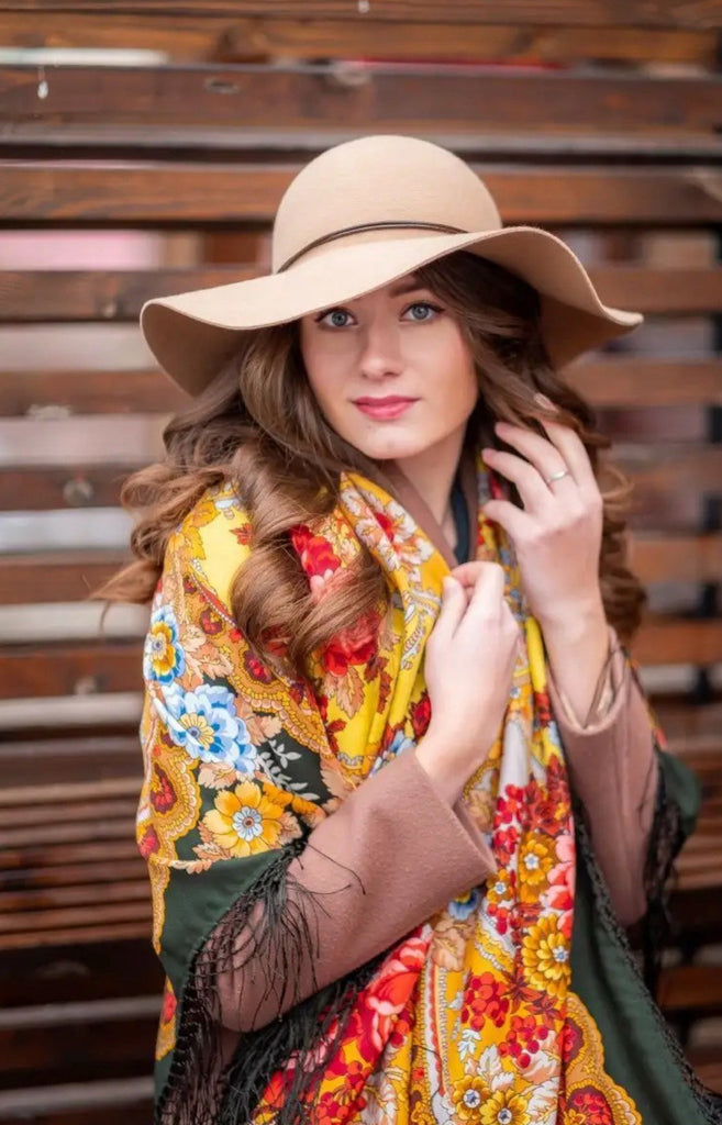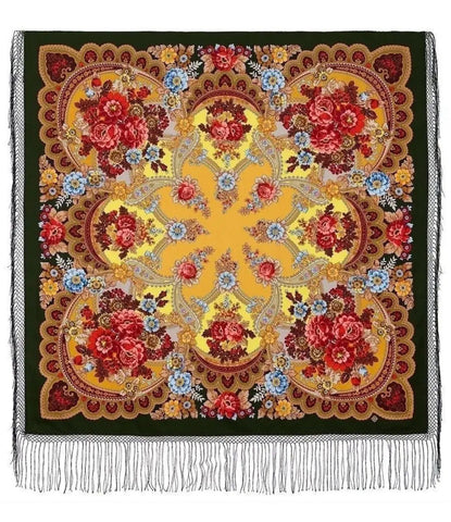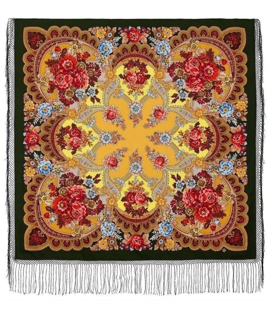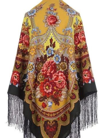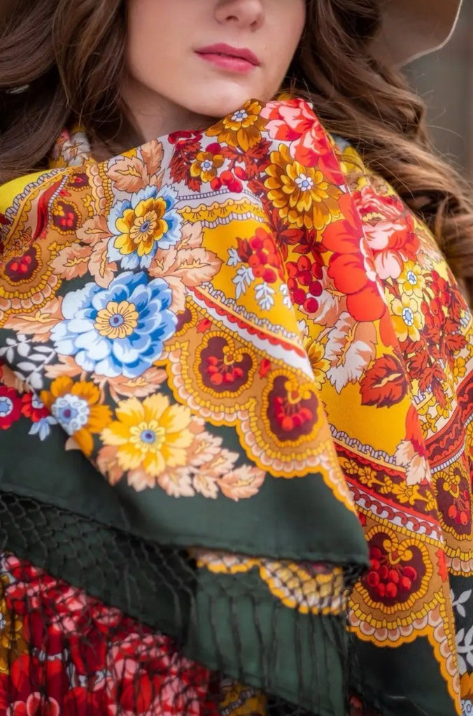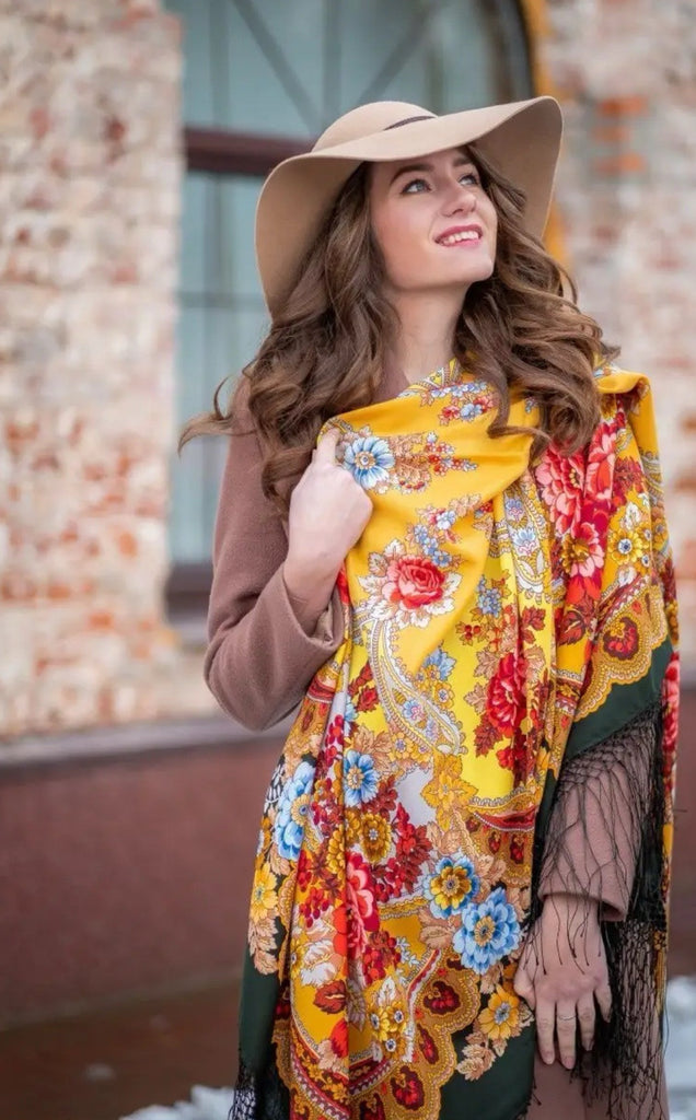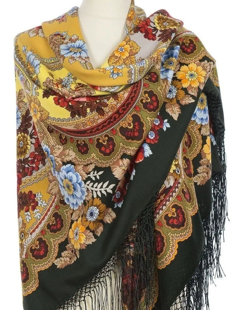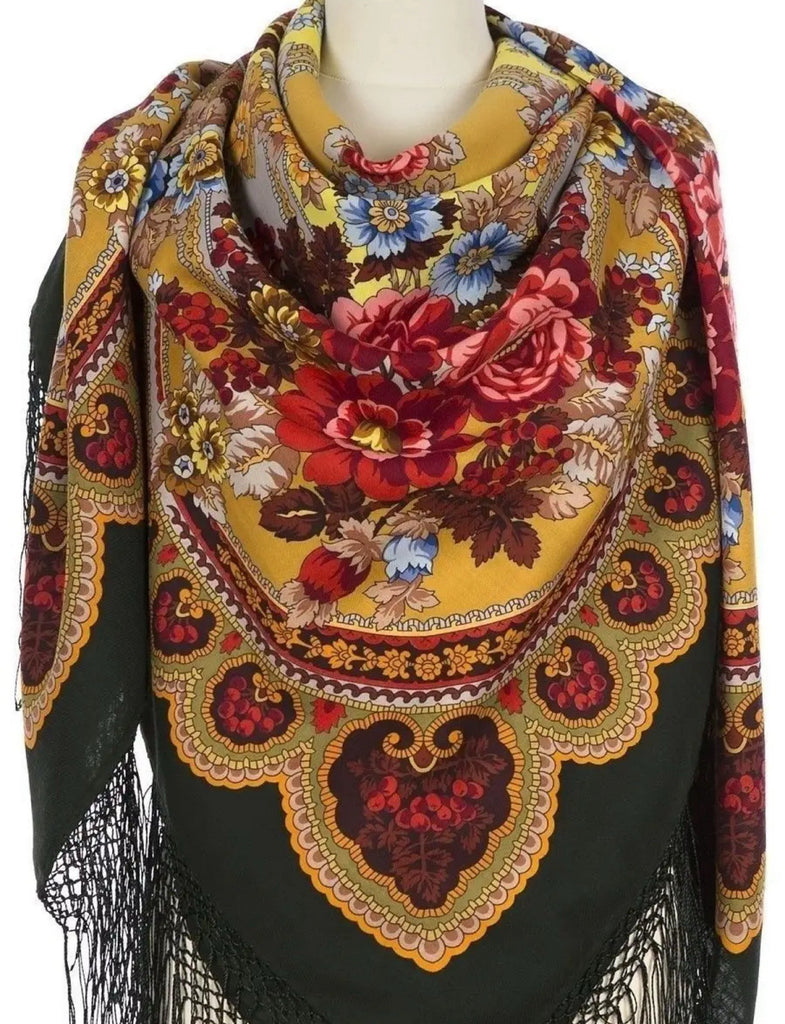 This 58'' big square merino wool scarf by Pavlovo Posad features a vibrant floral pattern in yellow, red, mustard, green, and light blue colors, with leaves and flowers as the main characters. The scarf is adorned with a silky fringe accent and is titled "Vremena goda. osen 708-10", translating to "Seasons of the year. Autumn 708-10", highlighting its nature-themed design. Made from high-quality Merino wool, this extra large scarf can be styled in various ways as a shawl, wrap, neck warmer, or stole, making it a versatile accessory for all seasons. This Merino wool bright yellow scarf