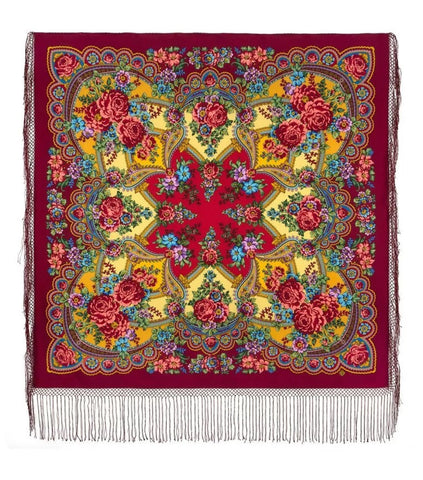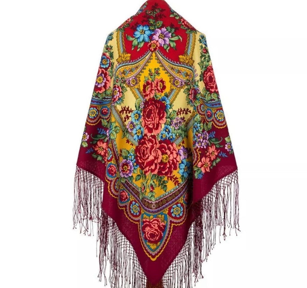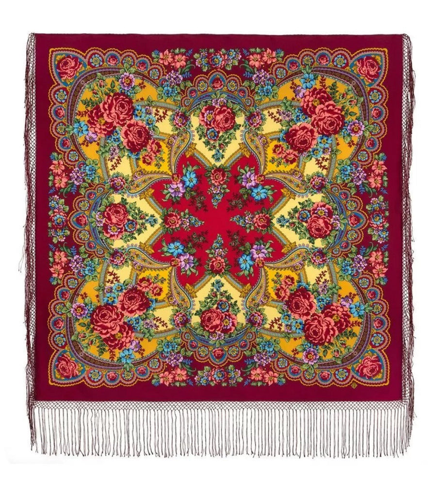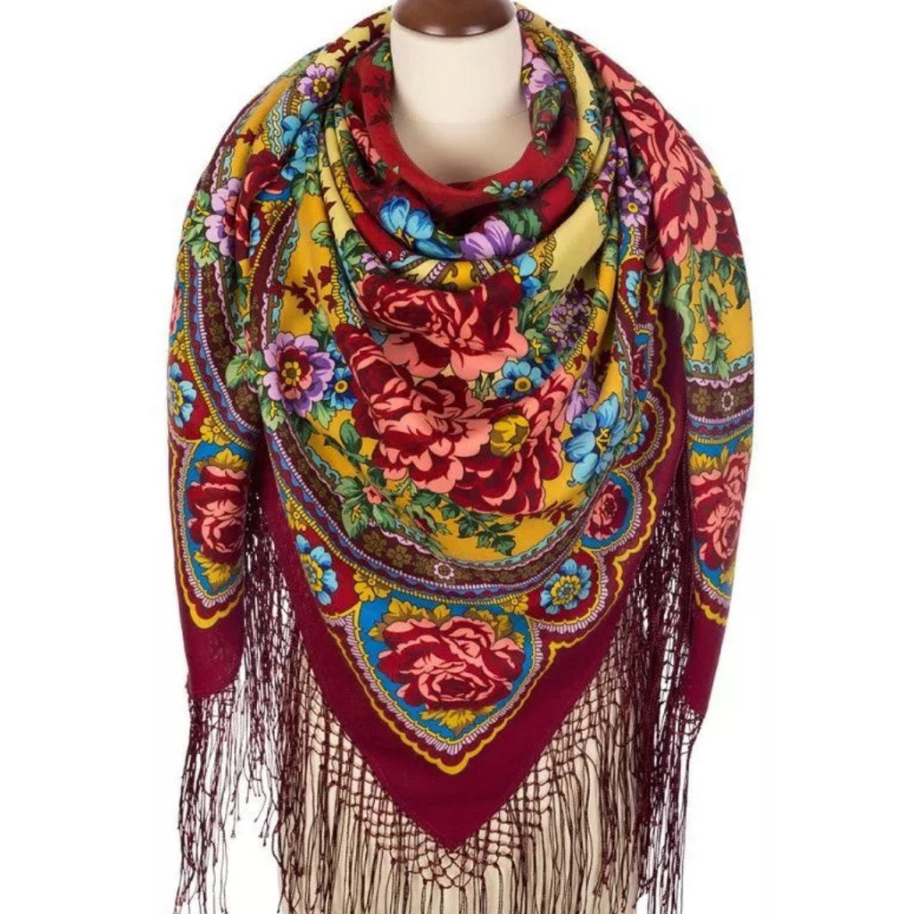 Wrap yourself in the warmth and elegance of the Pavlovo Posad 58'' big square scarf, a versatile addition to any wardrobe. Crafted from 100% Merino wool, this scarf is an ideal companion for all seasons, providing comfort and style with its rich burgundy, red, yellow, orange, and light blue floral pattern. The scarf's multiple features include its ability to function as a shawl, wrap, neck warmer, and stole, while its silky fringe adds a touch of sophistication.