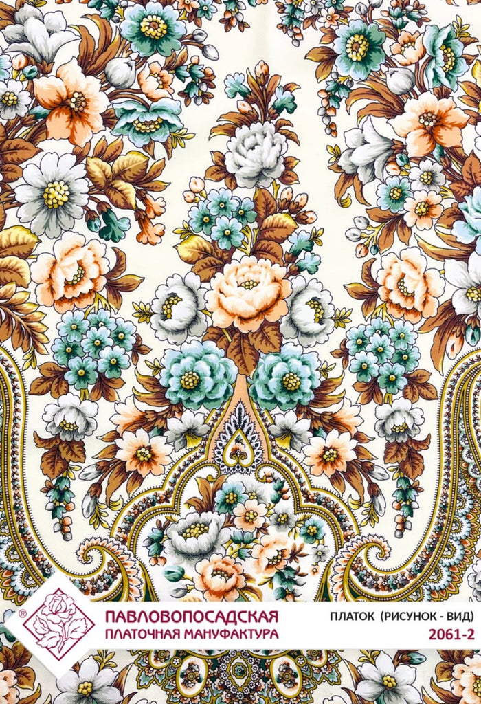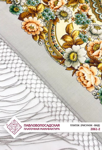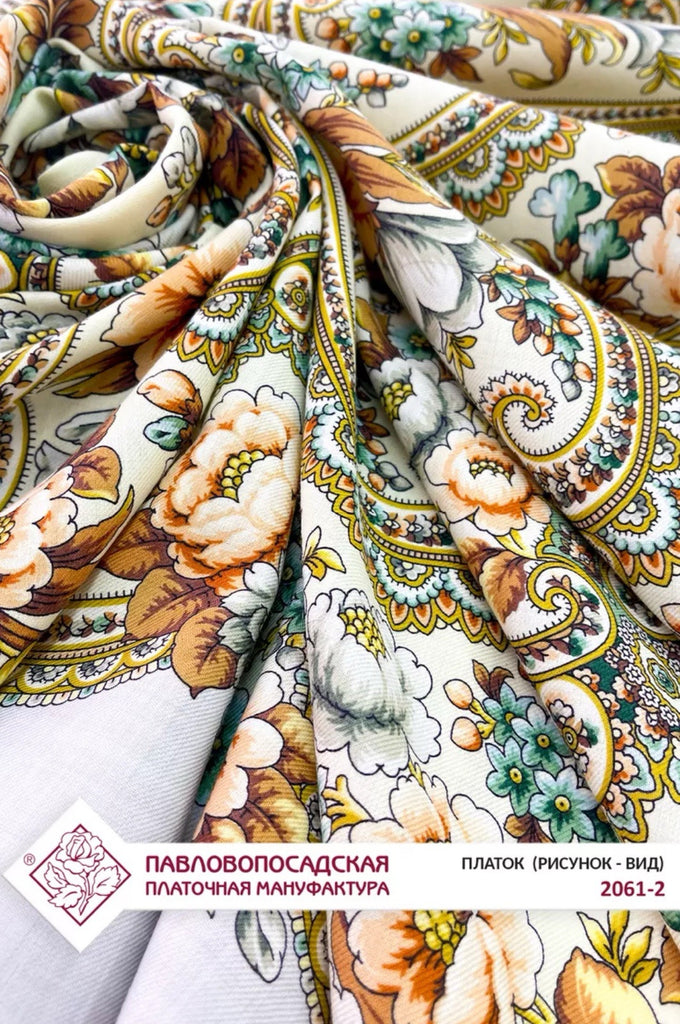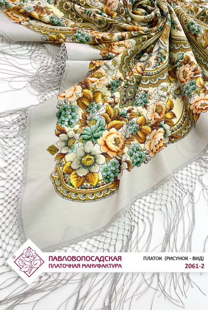 This 58-inch square gray scarf is made of merino wool with a green and yellow floral pattern, featuring leaves and flowers in an ethnic design. The scarf, titled "Tsarevna osen 2061-2," is from the brand Pavlovo Posad and is adorned with fringe accents. It can be styled in various ways such as a wrap, shawl, head scarf, or neck warmer, making it a multifunctional accessory suitable for all seasons. Embrace the warmth and
