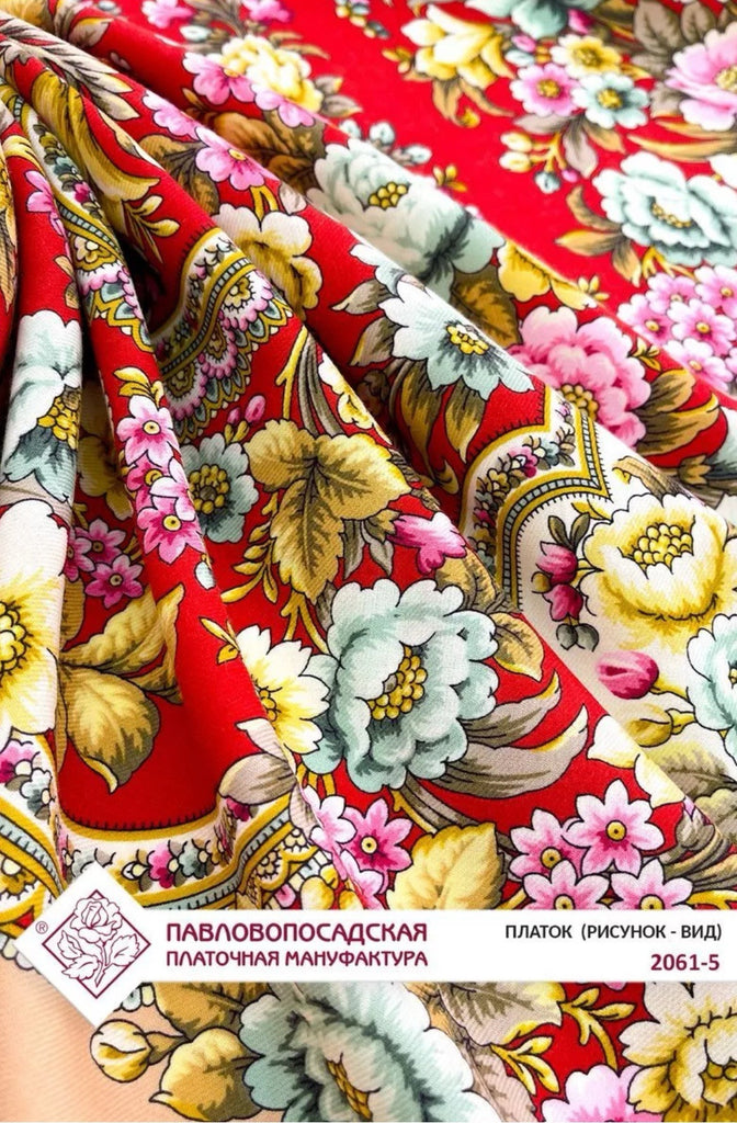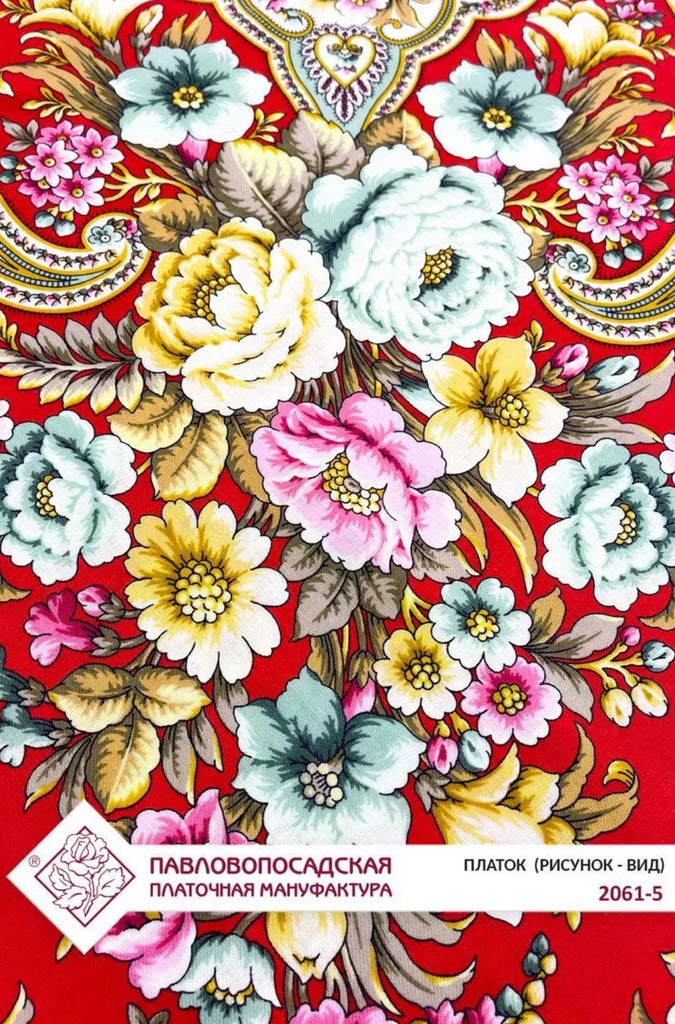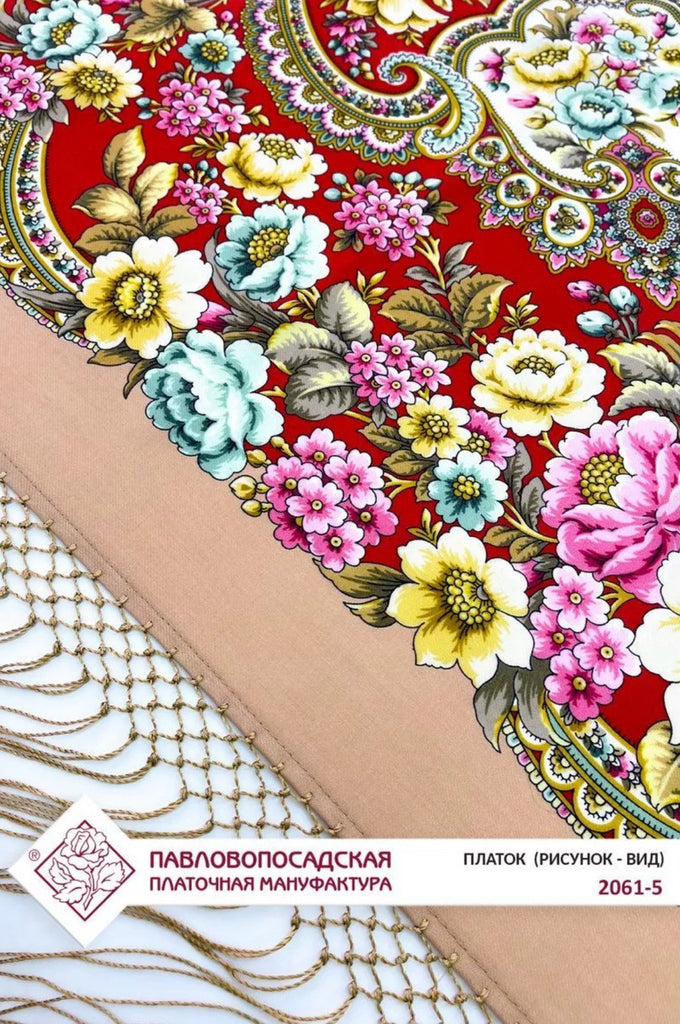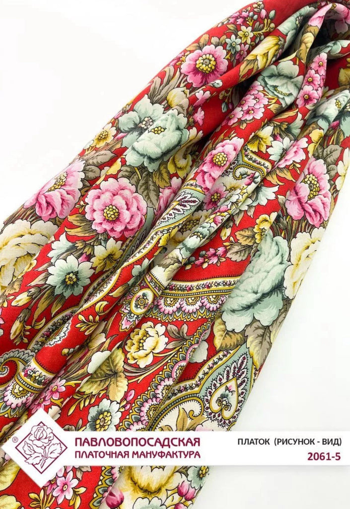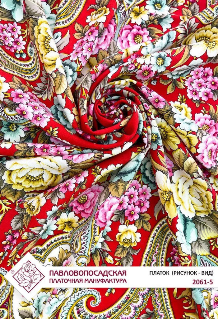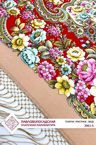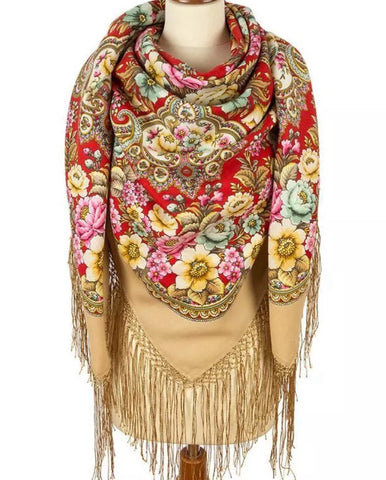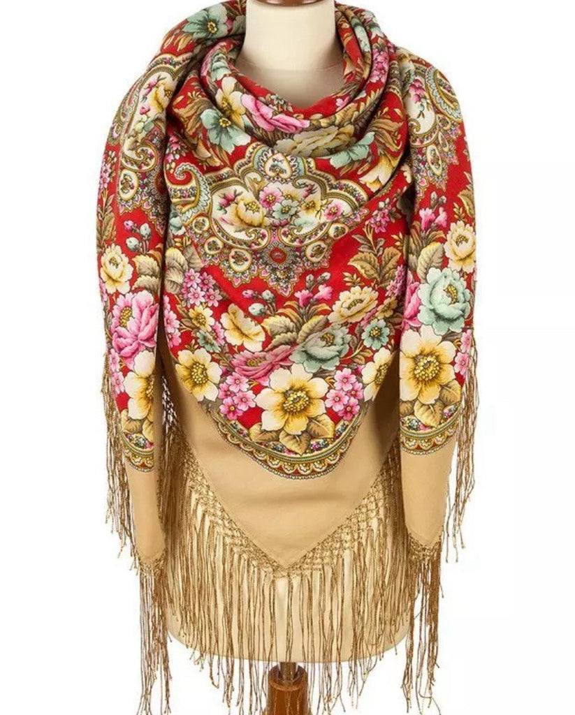 This 58" big square scarf is made of Merino wool with a pattern featuring red and yellow flowers in an ethnic style. The scarf, titled "Tsarevna osen 2061-5," is designed by the brand Pavlovo Posad in the Russian Federation. It includes fringe accents and can be styled in various ways such as a wrap, shawl, head scarf, neck warmer, or stole. This versatile scarf is ideal for all seasons, providing a touch of nature-inspired elegance to any outfit.