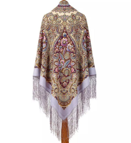 The product is a 58'' big square scarf made of merino wool, featuring a floral pattern with leaves and flowers in shades of greyish light blue, pink, gold beige, and beige. It has fringe accents and is designed with a square style. The scarf is versatile, serving as a higab, wrap, shawl, head scarf, neck warmer, or stole, making it suitable for all seasons. Made in the Russian Federation by Pavlovo Posad, this multifunctional accessory offers a touch of ethnic charm to any outfit.