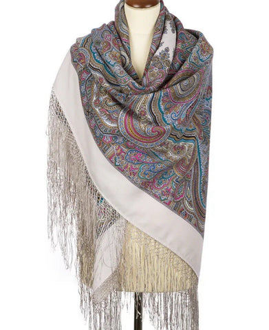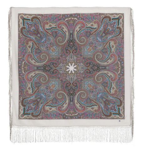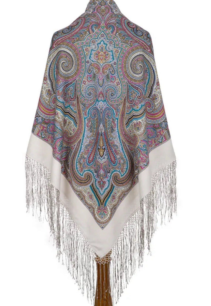 This 58’’ big square Russian scarf in gray is made of natural merino wool from Pavlovo Posad features a ethnic pattern. The scarf, titled "Dragotsennaya 1292-2," is designed in a nature theme, with fringe details and a versatile style that can be worn as a wrap, shawl, head scarf, neck warmer, or stole. This Russian-made woolen large scarf is suitable for winter, summer, fall, and spring seasons and is recommended for dry clean only.