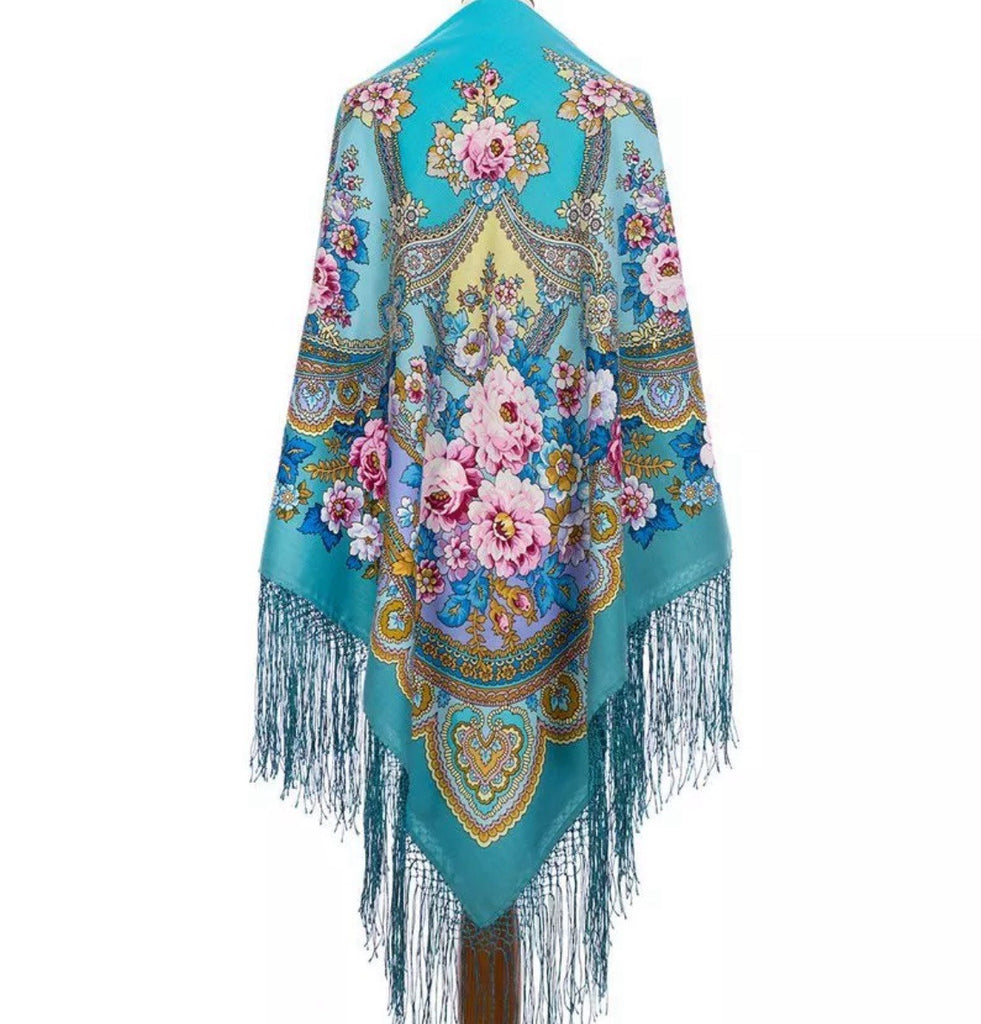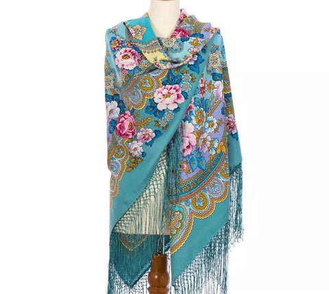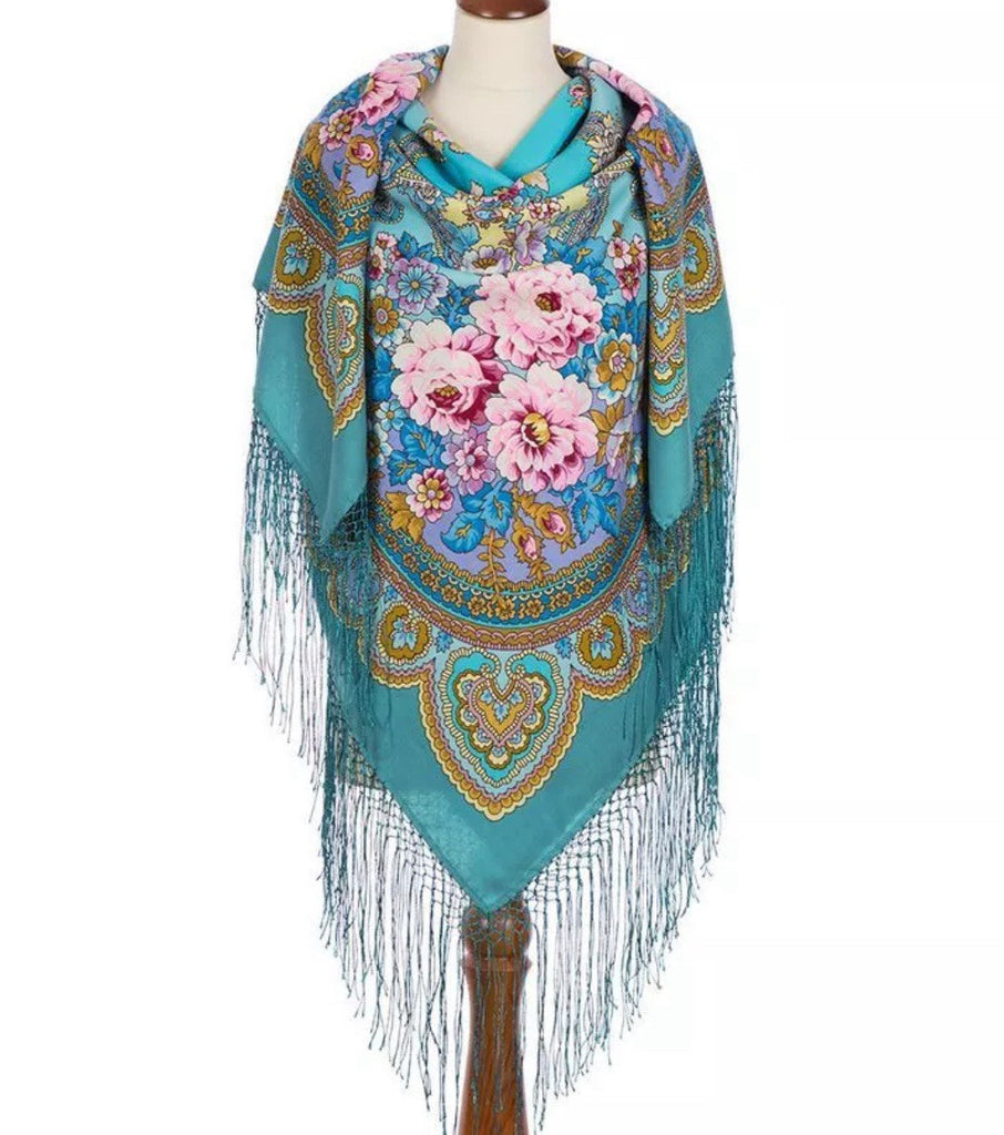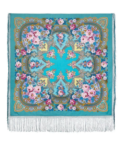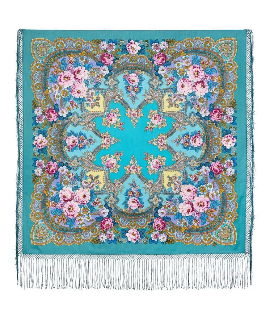 Wrap yourself in the timeless elegance of the Pavlovo Posad 58'' square shawl, a stunning blend of turquoise, pink, yellow, white, and light blue. Crafted from luxurious Merino wool, this versatile accessory is designed to elevate any outfit with its vibrant floral pattern featuring an array of flowers and leaves that capture the essence of nature.
