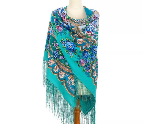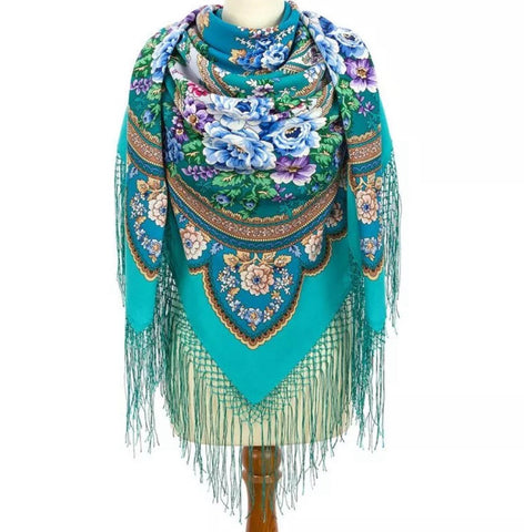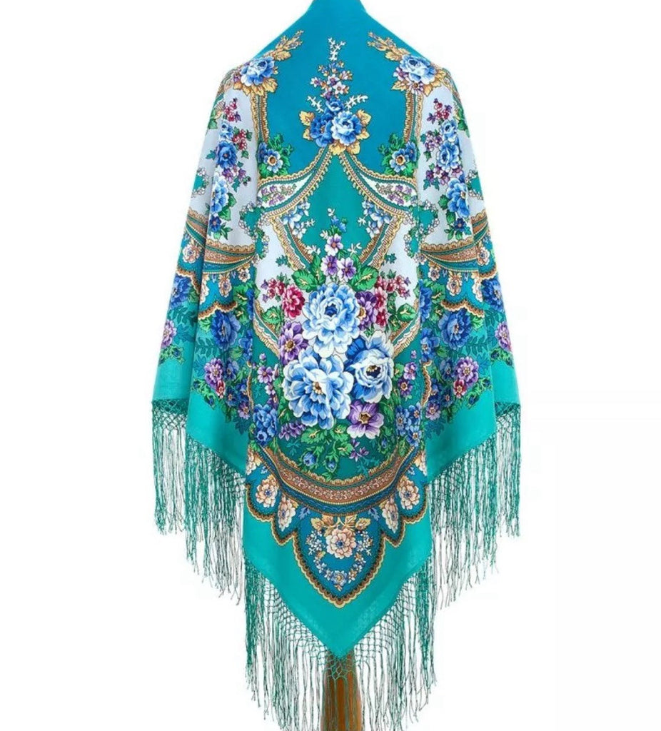 This multifunctional piece can be styled as a scarf, shawl, wrap, or stole to keep you warm and stylish throughout the year, transcending seasons from winter to summer. A silky fringe accentuates its edges, providing a luxurious finish to this elegant garment. Carefully designed for longevity, it requires dry clean only to maintain its allure. Whether you're dressing up for a special occasion or accenting your everyday wear, this Russian traditional scarf is an impeccable choice for any fashion-forward wardrobe.