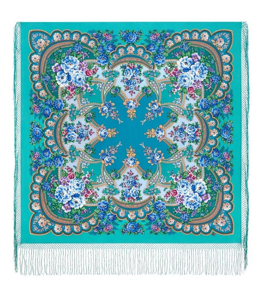 Wrap yourself in the timeless elegance of the Pavlovo Posad 58 inch square scarf, a versatile accessory that adds a touch of traditional charm to any outfit. Crafted from 100% merino wool, this scarf is a testament to the exquisite craftsmanship of the Russian Federation. Its vibrant palette of turquoise, light blue, and red is adorned with a delicate floral pattern, featuring an array of beautiful flowers that seem to bloom right before your eyes.