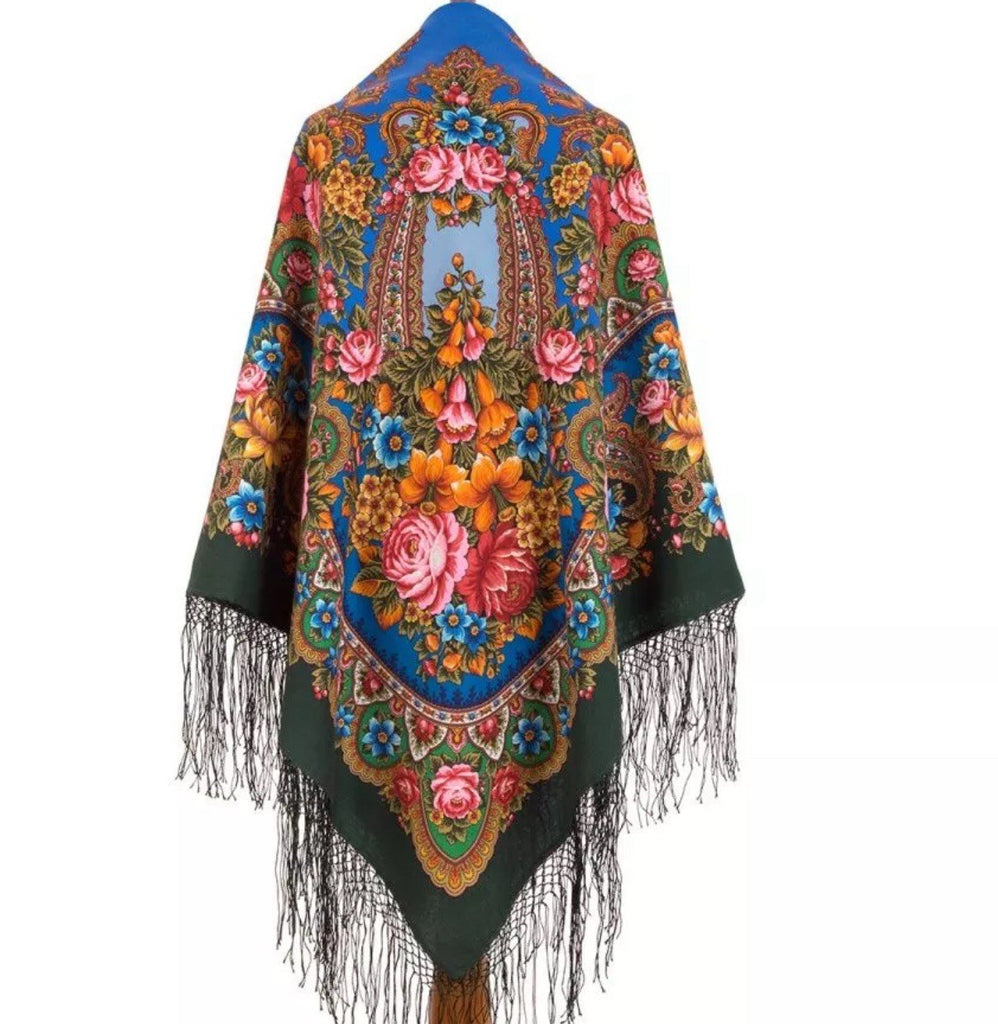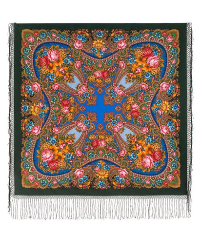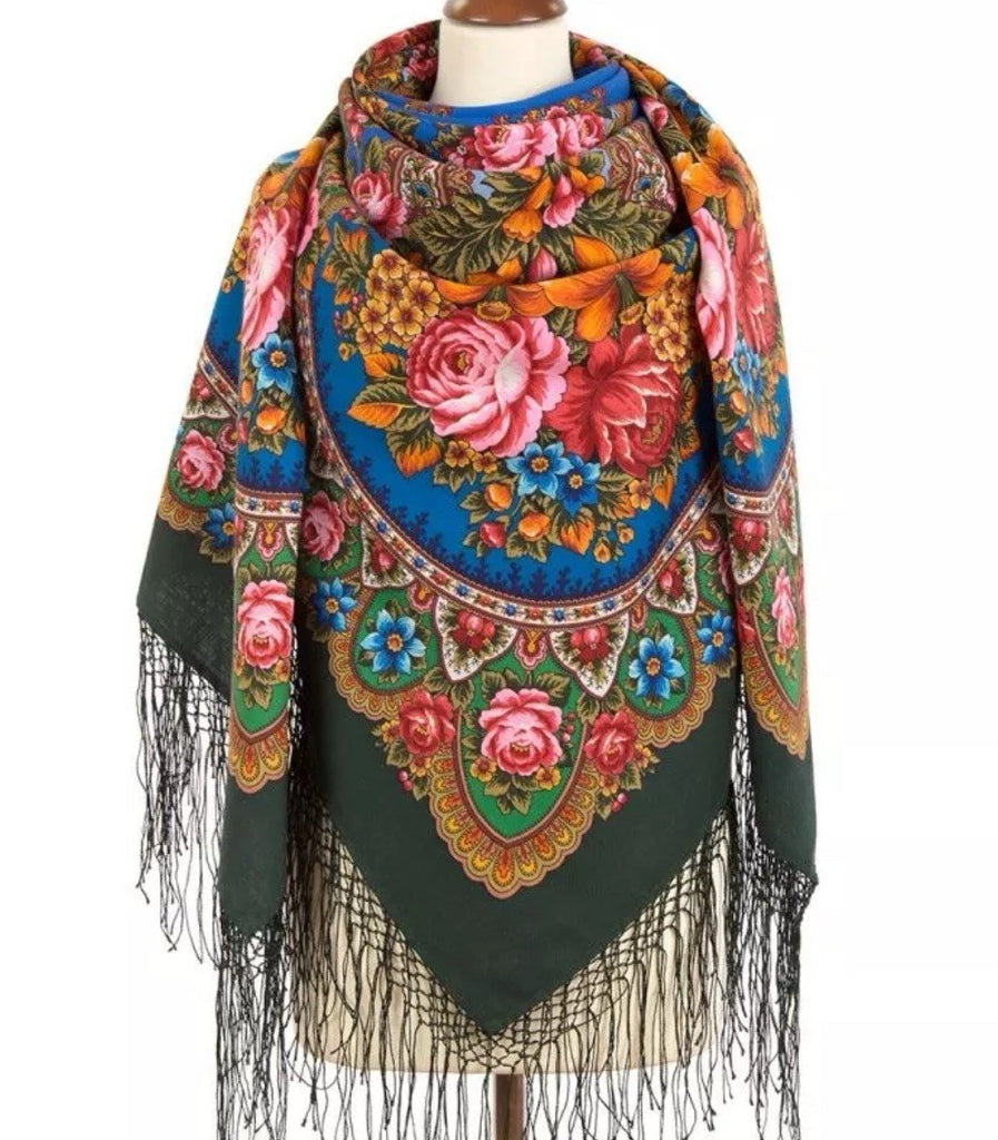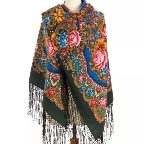 This 58'' square shawl features a beautiful pattern of large roses, perfect for adding a touch of nature to your outfit. Made from 100% merino wool, this bright shawl is not only stylish but also cozy and versatile. The intricate traditional Russian design, with accents of fringe, makes it a standout piece for any wardrobe. Ideal for all seasons, this wrapping cozy shawl can be worn as a headscarf, neck warmer, or simply as a stylish accessory. Made in Russian Federation, this Pavlovo Posad shawl is a unique and eye-catching addition to any collection. Our Russian beautiful big scarf is made of natural wool, providing a luxurious softness that is perfect for anyone. Give the women in your life a thoughtful gift that is sure to keep them warm and stylish.