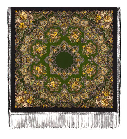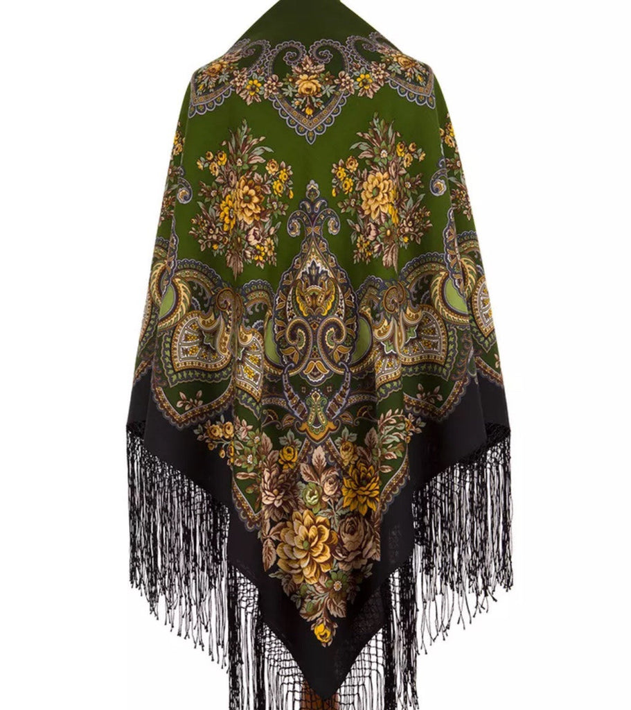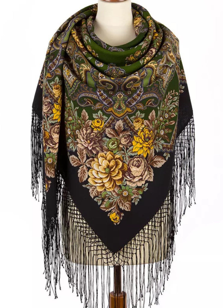 This 58'' square scarf by Pavlovo Posad is made of Merino wool in black, green, and yellow hues. The scarf features a floral pattern with leaves and flowers, along with silky fringe accents. The versatile very large scarf can be worn as a shawl, wrap, neck warmer, or stole, making it a multifunctional accessory suitable for all seasons. Perfect for adding a feminine touch of nature-inspired style to any outfit.