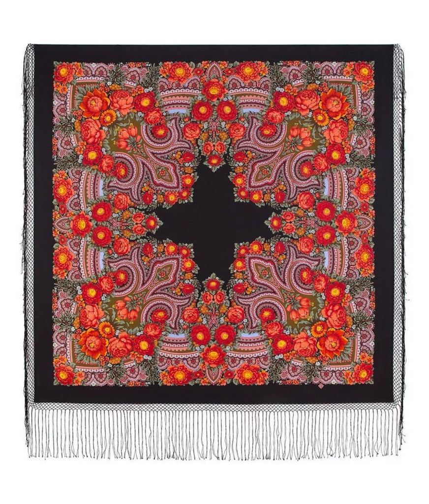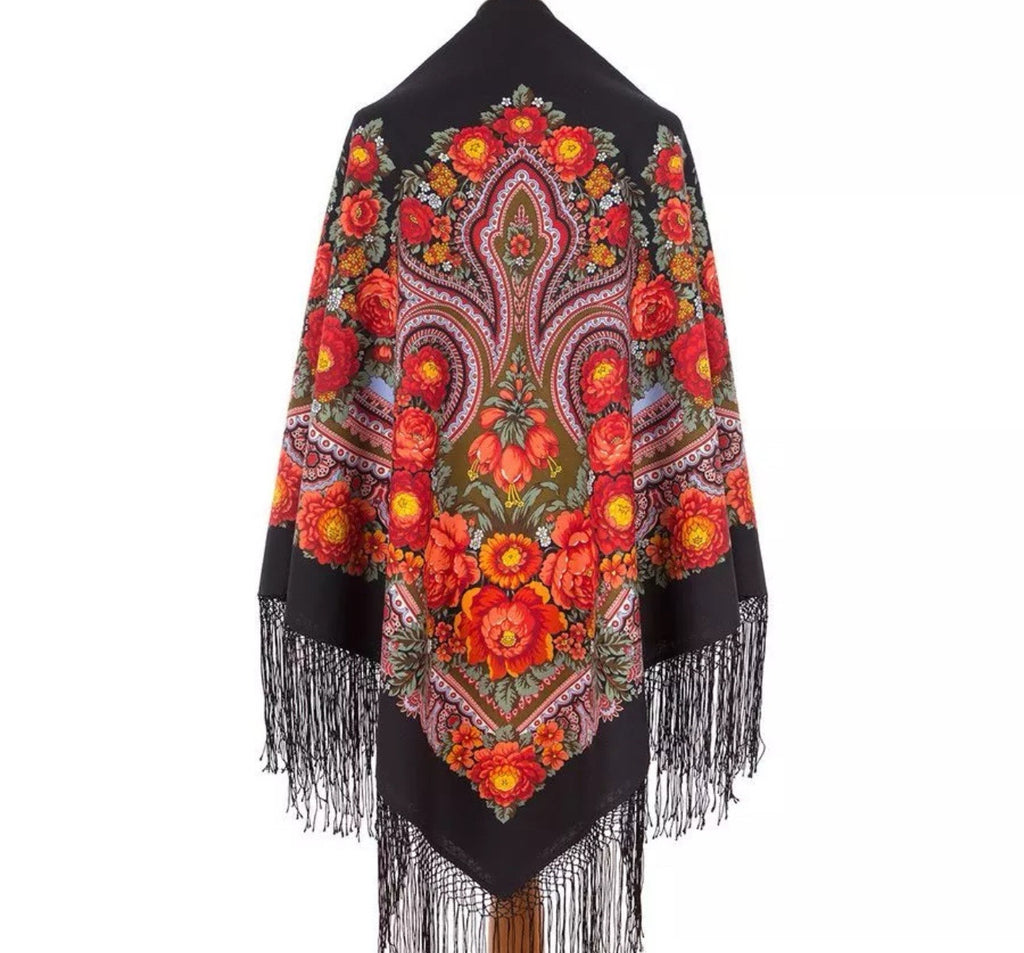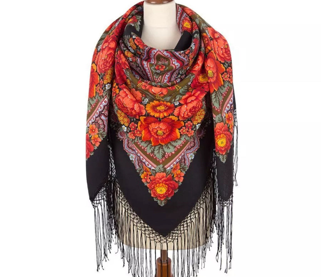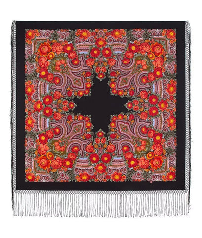 This 58’’ square scarf is made of 100% Merino wool in a black, red, and floral design from the Russian brand Pavlovo Posad. This Russian scarf is a perfect gift and features leaves, flowers, and ethnic accents with fringe details, perfect for adding a touch of Slavic-inspired style to any outfit. Versatile for all seasons, it can be worn as a shawl, head scarf, neck warmer, or stole, offering a multifunctional accessory that adds elegance and warmth.