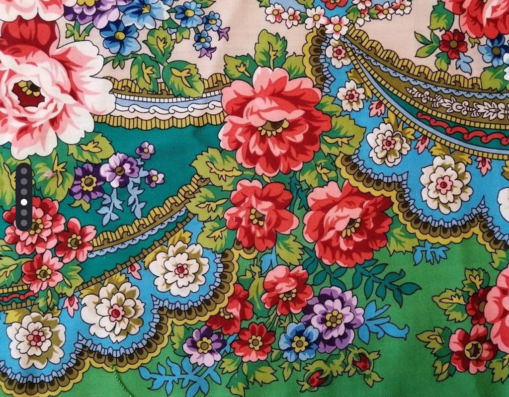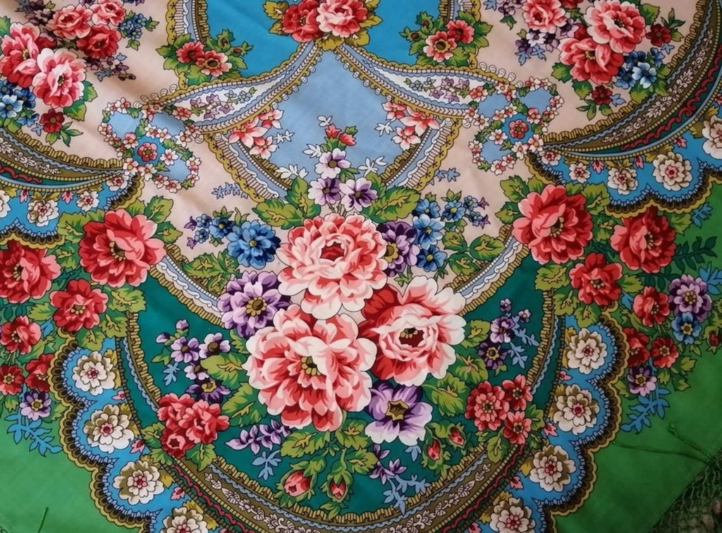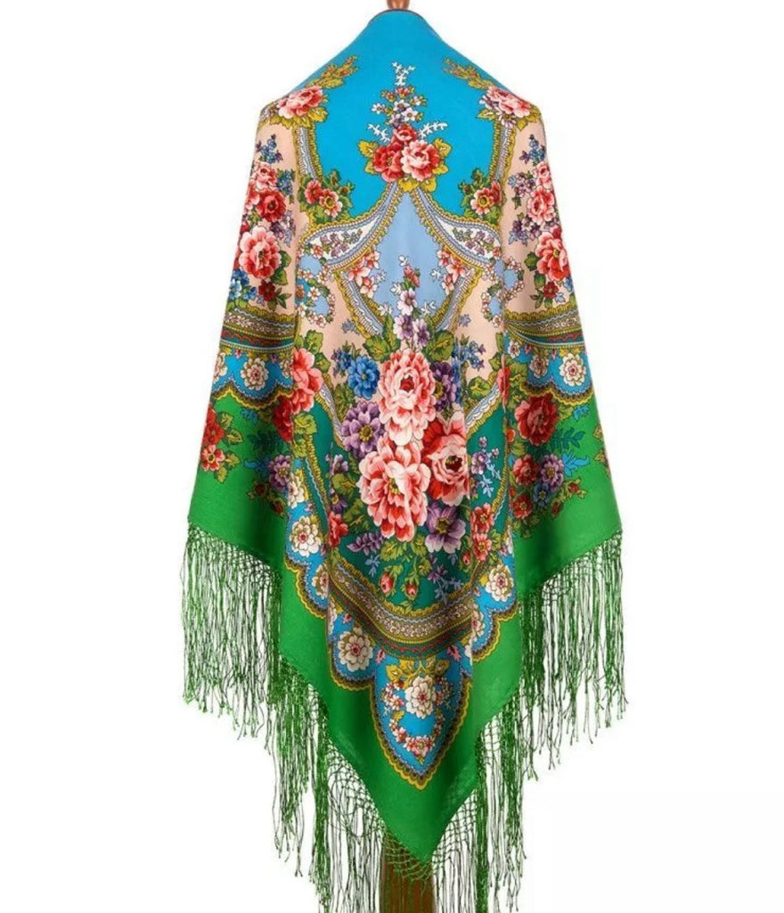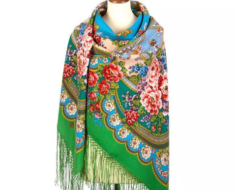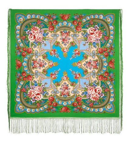 Wrap yourself in the timeless elegance of the Pavlovo Posad 58'' square scarf, a versatile accessory that transcends seasons. Crafted from 100% merino wool, this Russian traditional scarf ensures warmth and comfort with a luxurious softness that only natural wool can provide. Its vibrant palette of light blue, bright green, red, and peach is as refreshing as it is fashionable, making it a perfect complement to any outfit.