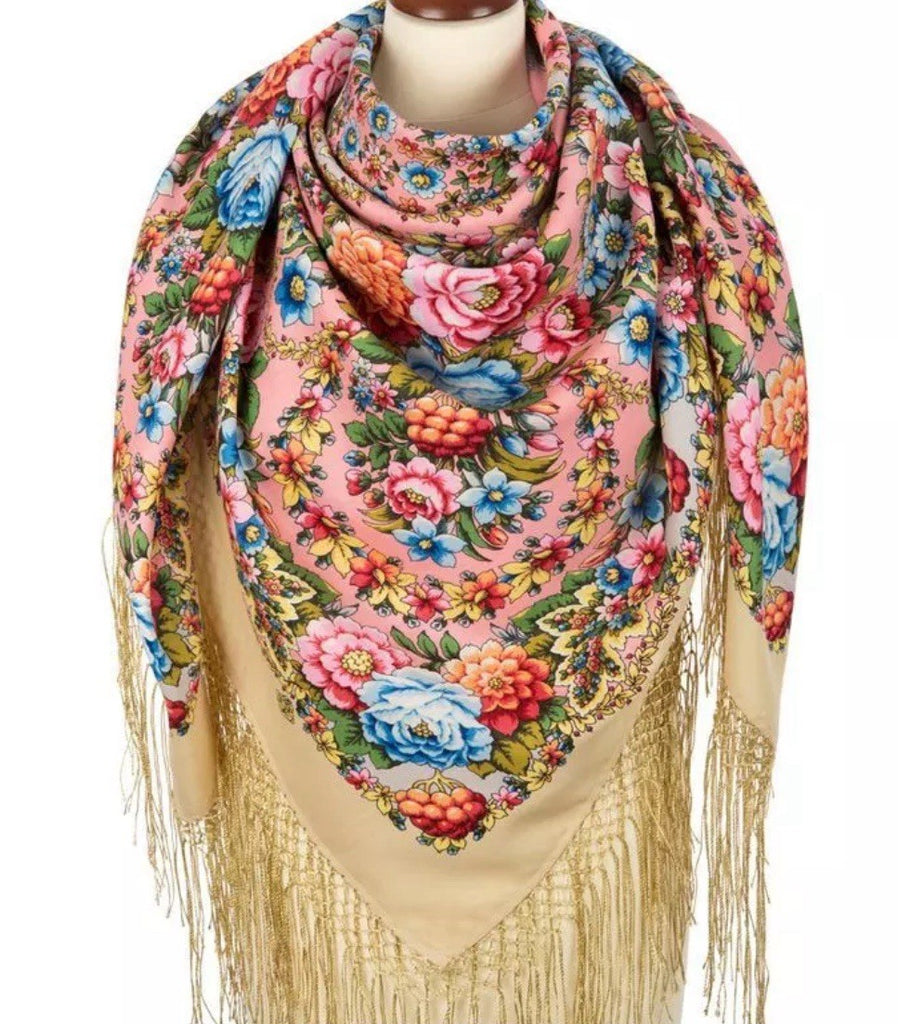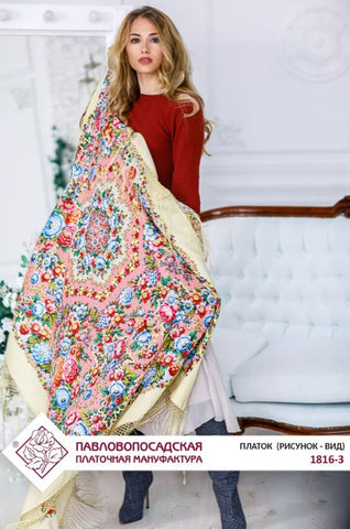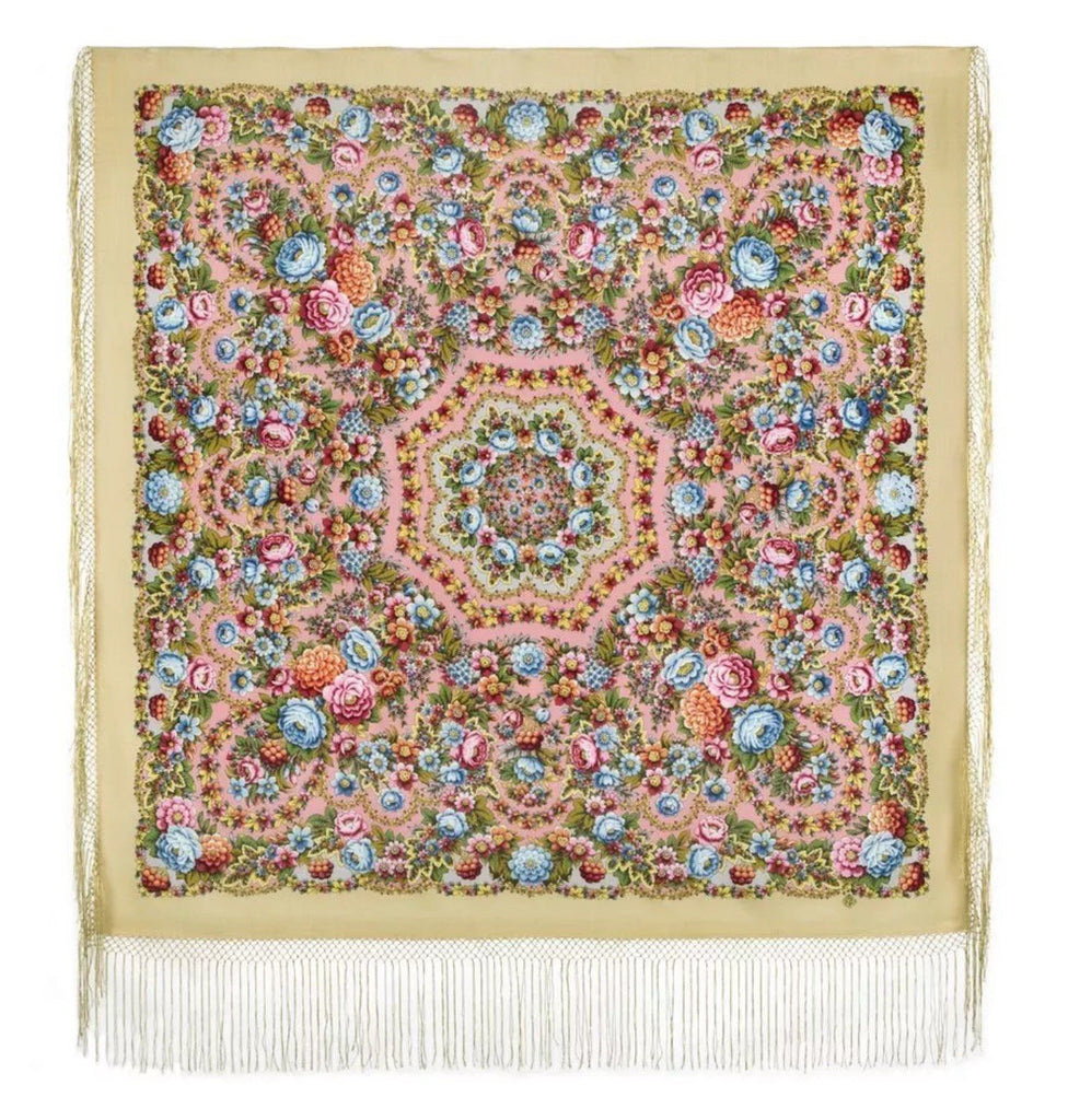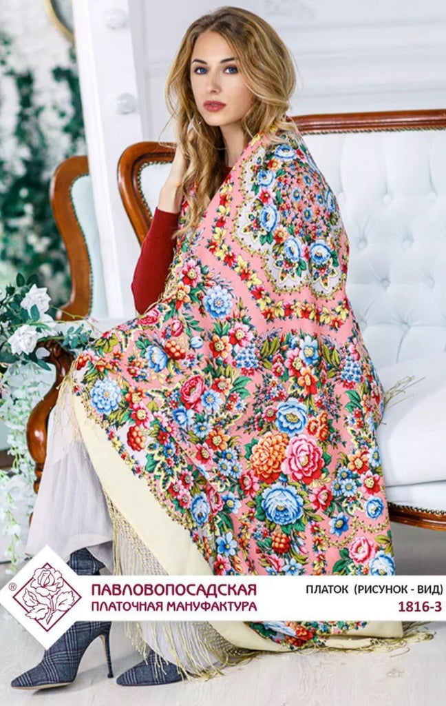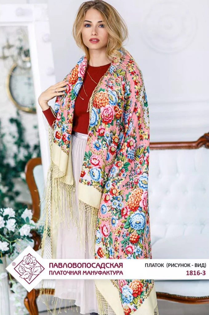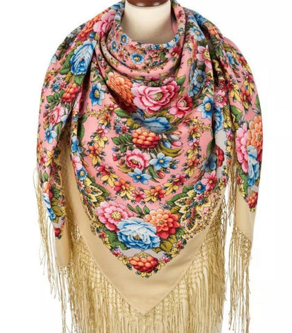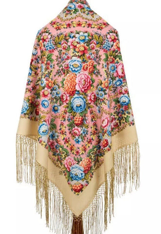 This 58'' square scarf from Pavlovo Posad is made of luxurious 100% merino wool, featuring a beautiful floral pattern with pink, light blue, and sand colors. The scarf can be worn as a shawl, wrap, neck warmer, or stole, making it a versatile and stylish accessory for any season. The silky fringe adds a touch of elegance to this nature-themed piece, perfect for adding a pop of color and sophistication to any outfit. Made in the Russian Federation, this scarf is designed for women who appreciate quality craftsmanship and timeless style. We offer original scarves from the renowned Russian brand Pavlovo Posad, known worldwide since the mid-19th century for its rich heritage and exceptional craftsmanship.