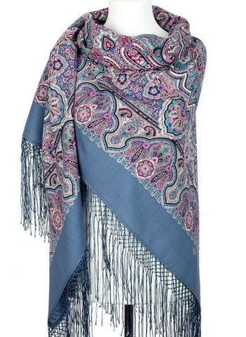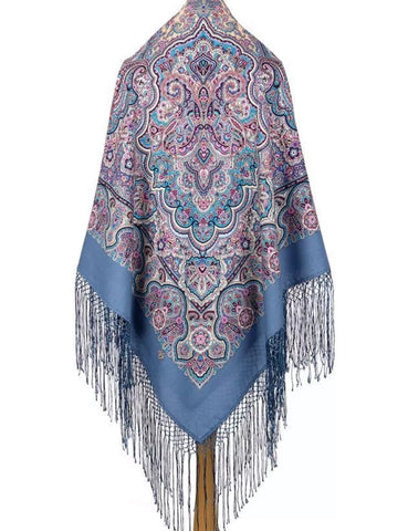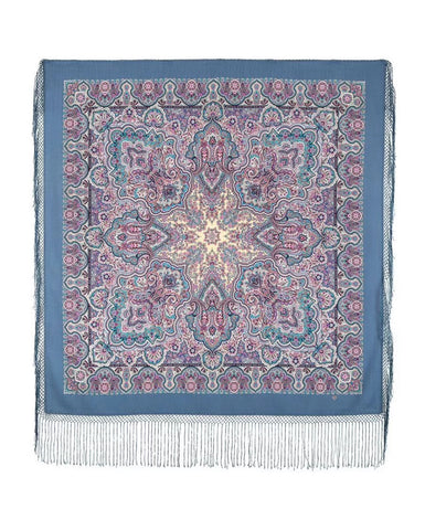 This 58'' square scarf is made of 100% merino wool in light blue, purple, and creamy white colors, featuring a herbal ethnic pattern. The scarf, titled "Bogataya Nevesta 1781-1" by the brand Pavlovo Posad, includes fringe accents and can be styled in various ways such as a wrap, shawl, head scarf, neck warmer, or hijab. Perfect for all seasons, this versatile scarf adds a touch of nature-inspired elegance to any outfit with its delicate design and high-quality material from the Russian Federation. Each intricate design