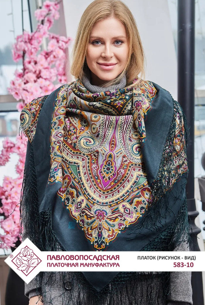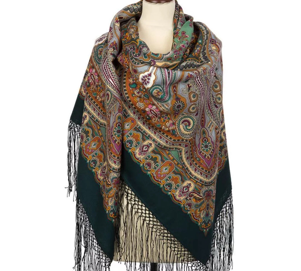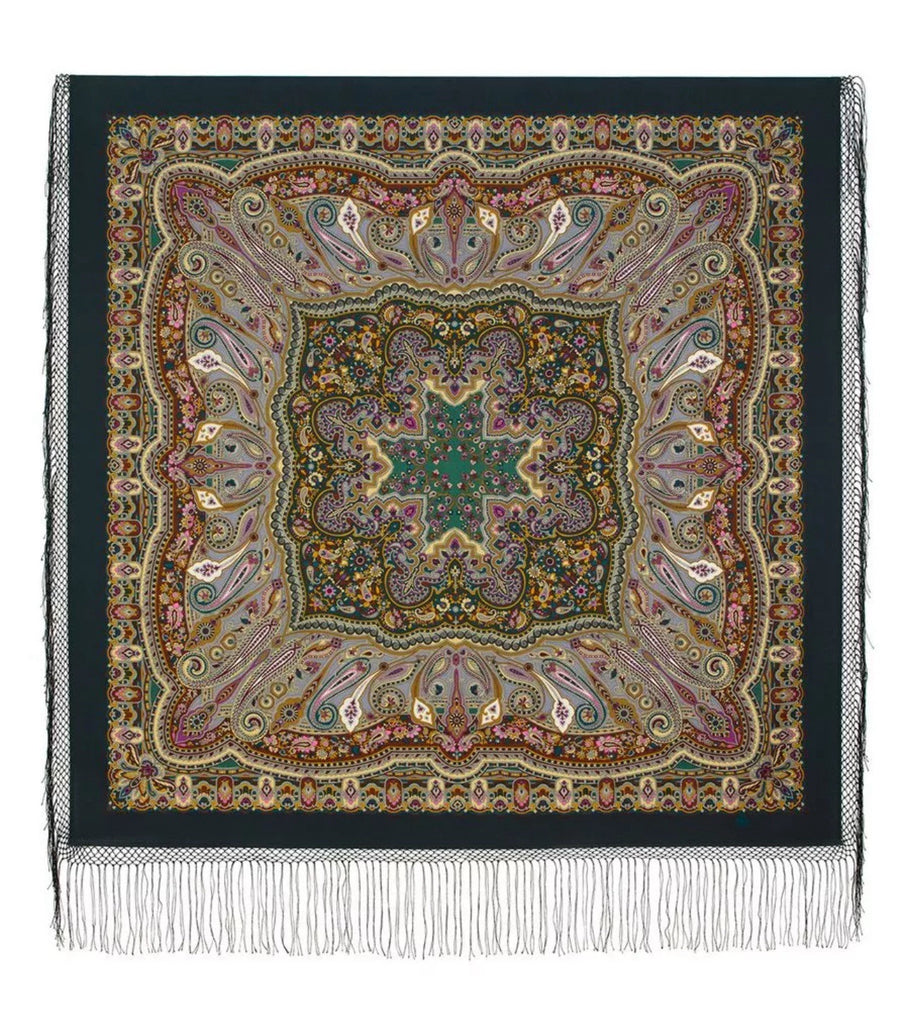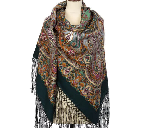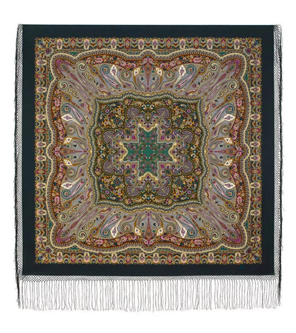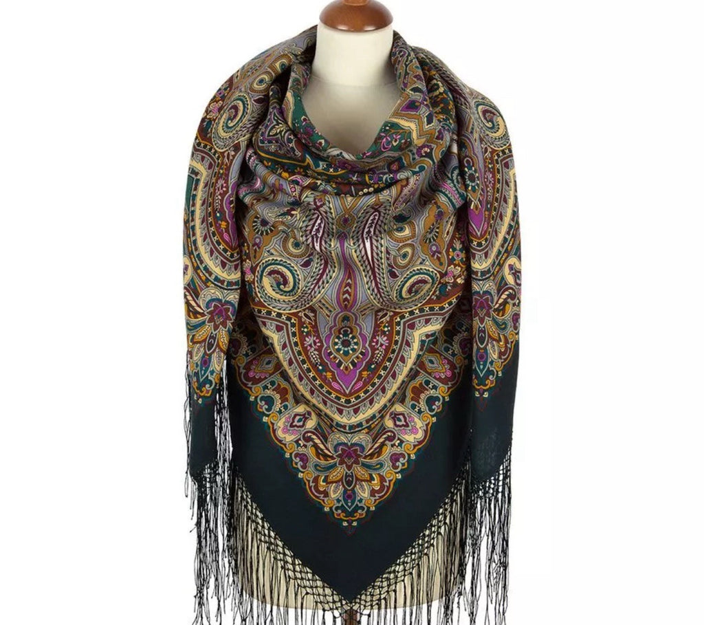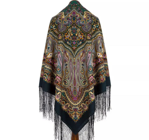 This 58-inch square scarf is made of high-quality merino wool in a vintage-inspired design from Pavlovo Posad. The scarf features a floral pattern in black and green colors, with accents of fringe. The versatile scarf can be worn as a wrap, shawl, head scarf, neck warmer, or stole, making it perfect for any season. Its Slavic-themed design of leaves and flowers adds a touch of elegance to any outfit, while the dry clean only care instructions ensure its longevity. The edges of the scarf