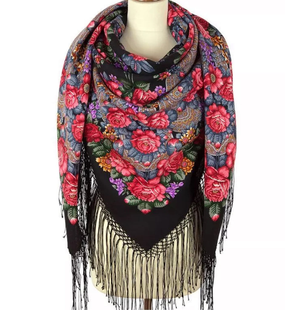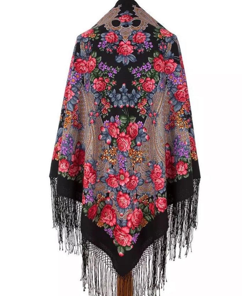comfort and style with our natural merino wool scarf. Featuring a beautiful elegant black color and vintage-style roses in red with purple and green details, this Russian