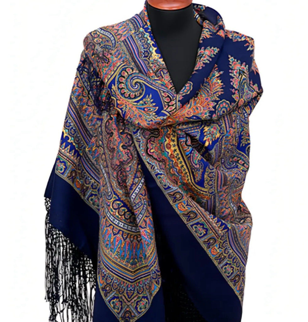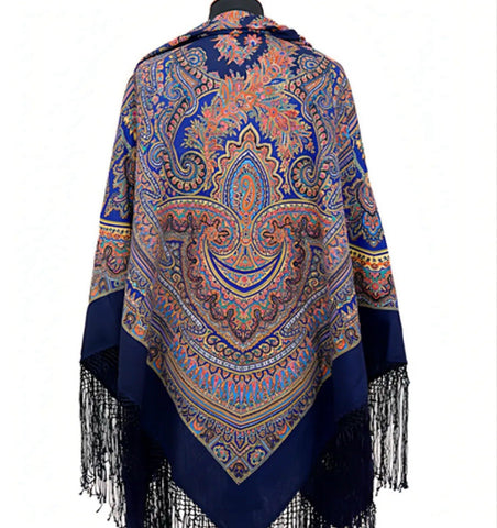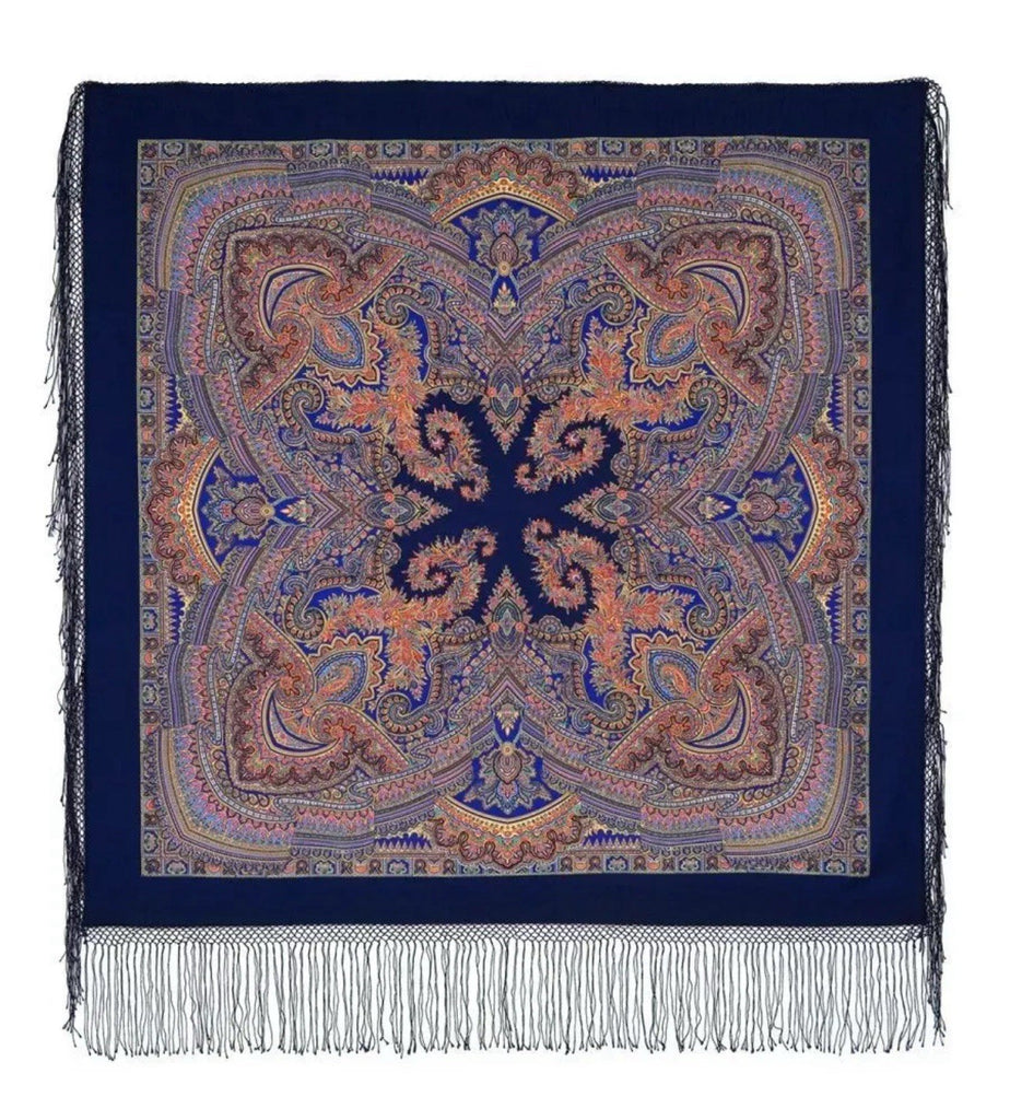 Wrap yourself in the warmth and elegance of this Pavlovo Posad 58'' square scarf, a versatile addition to any wardrobe. Crafted from 100% merino wool, this soft and warm wrapping scarf boasts a luxurious softness that's perfect for any season. Its multi-colored palette of navy, yellow and orange is inspired by the beauty of nature, featuring an intricate floral pattern with leaves and flowers that add a touch of sophistication to your ensemble.