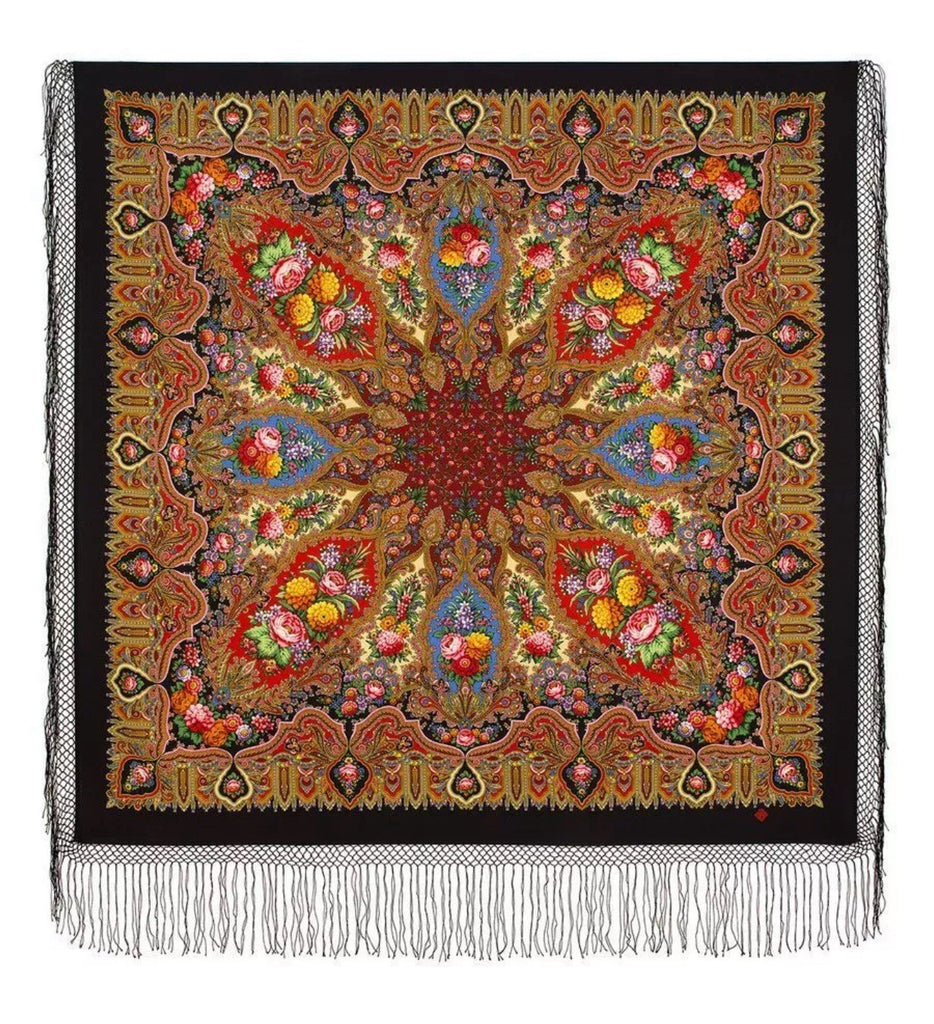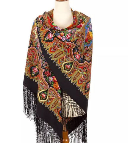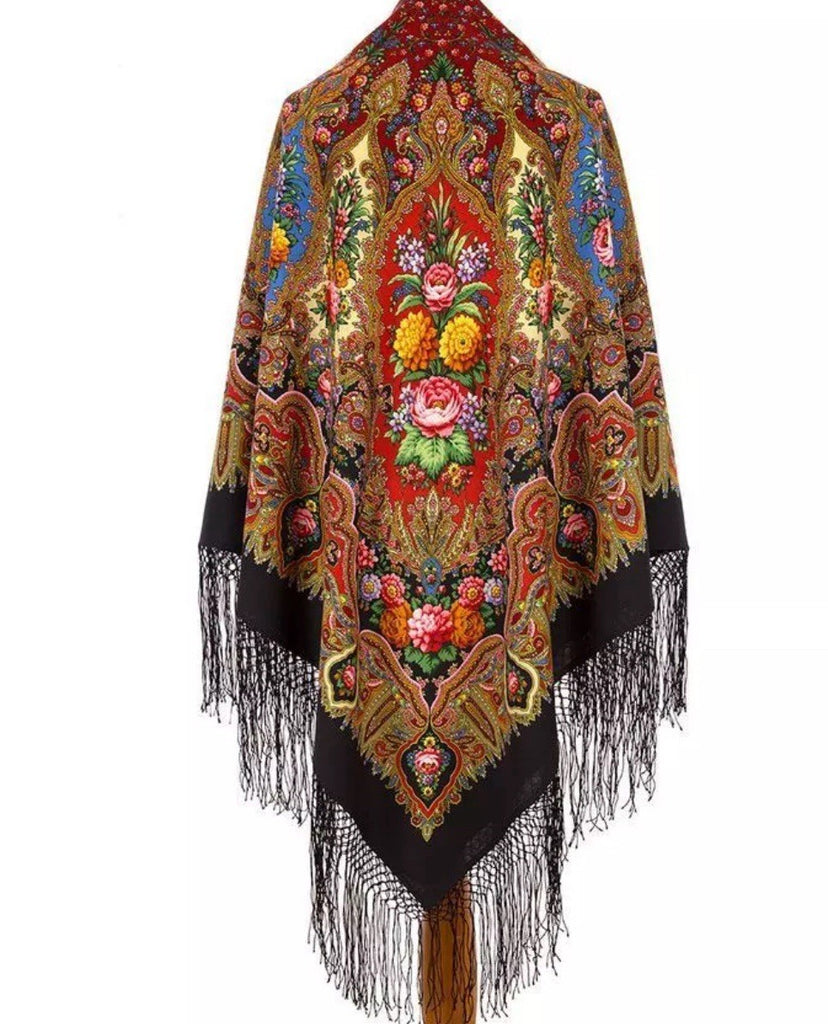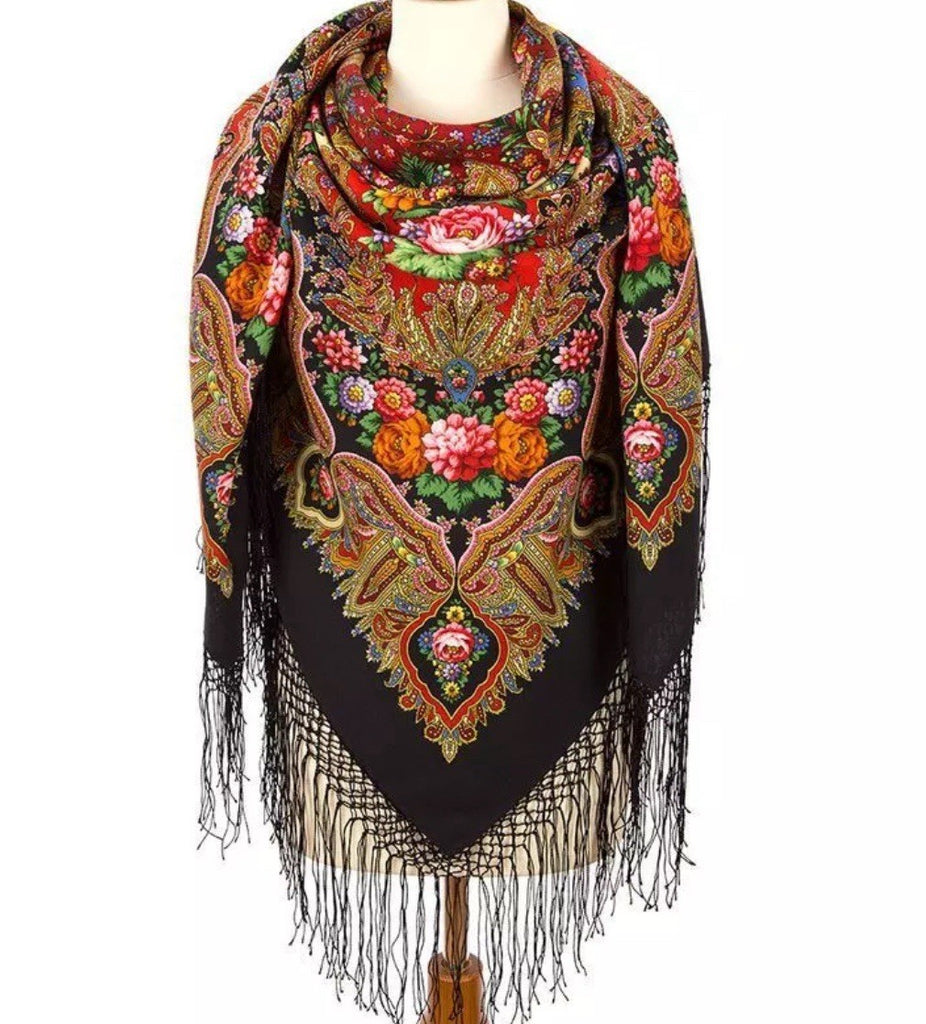 This traditional Russian scarf from Pavlovo Posad is a stunning 58'' square made of 100% merino wool. The intricate floral pattern of leaves and peony flowers in burgundy, red, yellow, green, and black colors adds a touch of nature to your wardrobe. The cozy and warm colorful scarf features fringe accents and can be used as a wrapping shawl, wrap, neck warmer, or stole, making it a versatile and stylish accessory for any season. Its high-quality material and design make it a timeless piece for any woman's clothing collection. This Russian beautiful