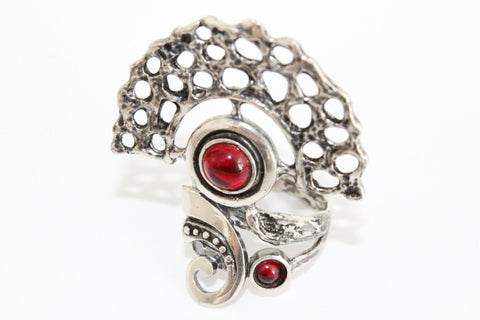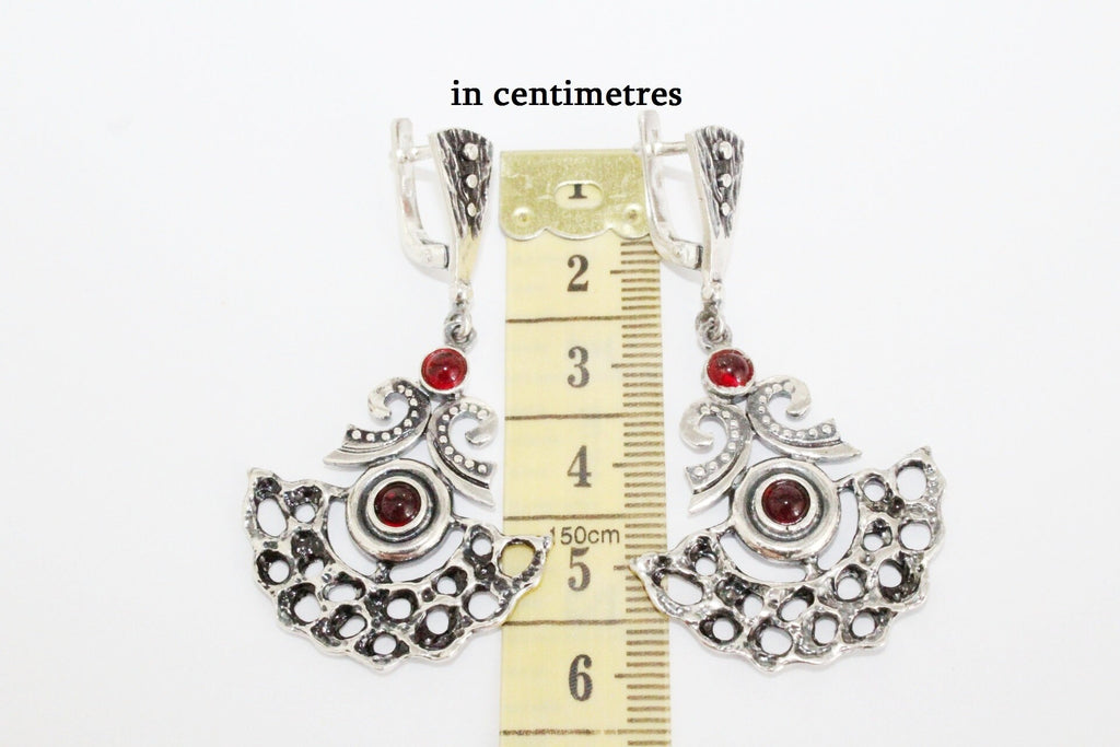 Enhance your style with this gorgeous 925 SILVER set of earrings and ring. Handmade in Armenia, these Extra-large pieces feature a red garnet stone and a beautiful Half circle tribal design, representing the richness and beauty of Armenian culture. Elevate your look with these high-quality pieces. Indulge in high-quality fashion with our 925 silver set of earrings and ring for women. Designed for the modern, stylish buyer, our set includes stunning pieces stamped with 925 authenticity.