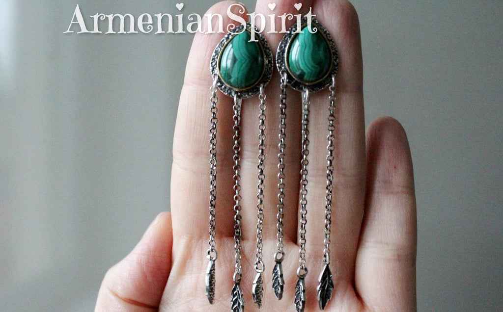Enhance your jewelry collection with these high-quality sterling silver925 earrings from our Etsy shop. Each pair features unique Armenian design, malachite gemstones, and delicate chain dangle details. Choose from variety of gemstone options and enjoy the easy-to-use English closure.