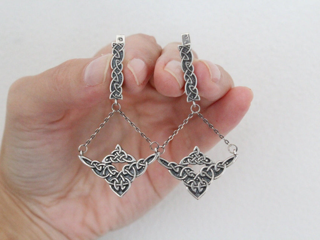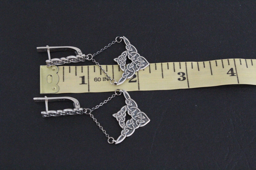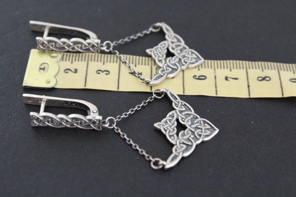 What earrings to choose for a boho style coat? Check out these lovely tribal style 925 sterling silver earrings. They are with Armenian patterns and ornaments. These chain earrings look great with both very long hair and short hair. When the neck is open, long dangling earrings look very impressive and it attracts the eyes of the surrounding people.