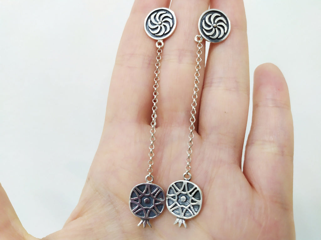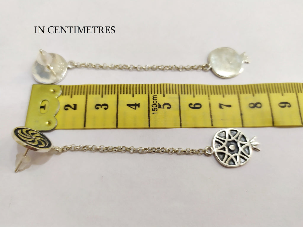 Expertly crafted with 925 silver, these Armenian long chain earrings are a modern spectacle. Adorned with an eternity symbol and pomegranate, these shoulder earrings exude both style and symbolism, making them a perfect addition to any outfit.