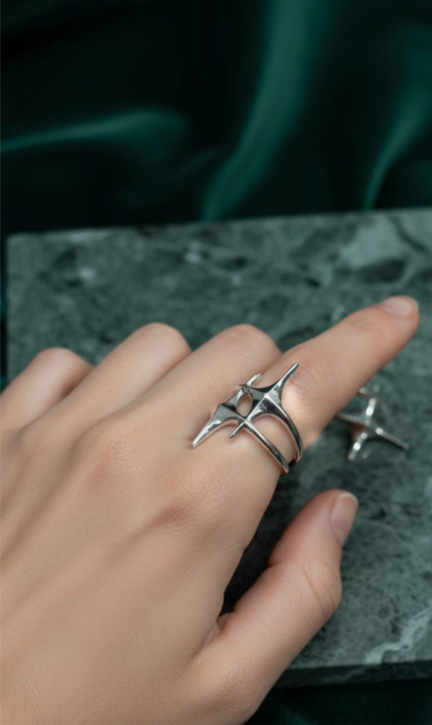 Celestial vibes meet contemporary design in this striking sterling silver ring. Two abstract stars dance across the band in bold, geometric forms—perfect for stargazers and modern minimalists alike. Crafted from genuine 925 sterling silver, it's lightweight enough for everyday wear yet statement-making enough to turn heads. Whether you're channeling cosmic energy or just love a touch of whimsy on your fingers, this ring brings a playful spark to any look.