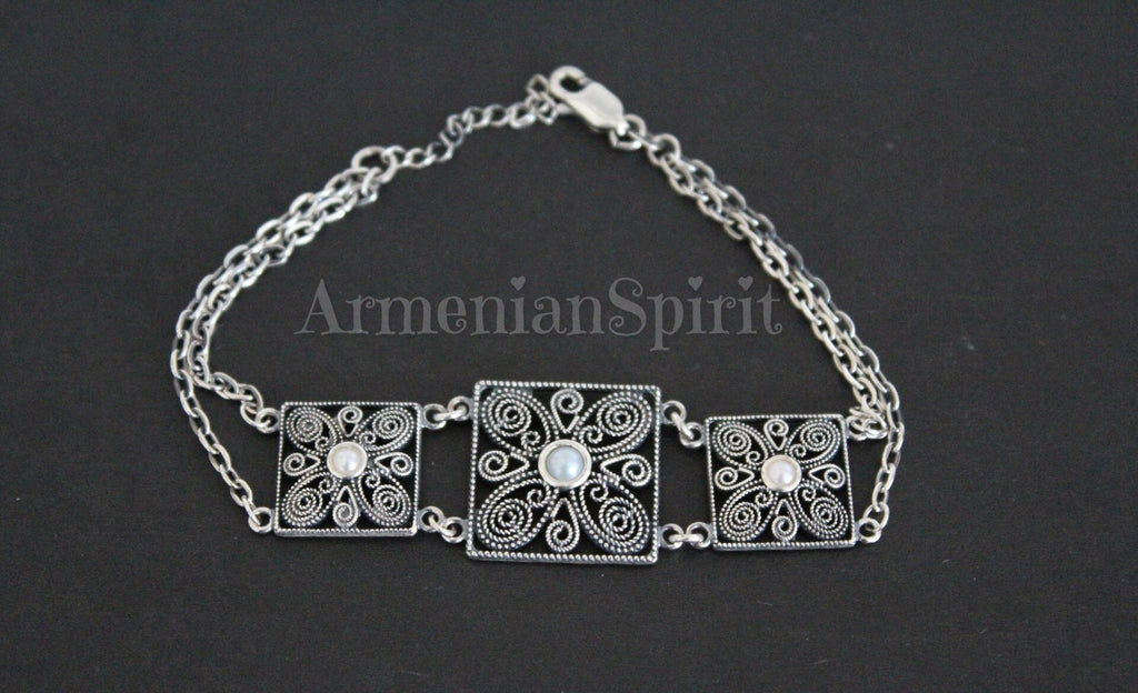 Introducing our exquisite Armenian traditional floral jewelry featuring a stunning sterling silver 925 filigree design and a beautiful lab white pearl. Elevate your style and shop with joy and happiness on Armenian Spirit - the best place to find unique jewelry. Discover the endless possibilities of pure silver with our high quality jewelry from the Armenian best silver store. Enjoy discounts and free shipping for a worldwide delivery. Elevate your style and make a statement with our stunning pieces.