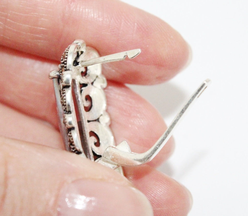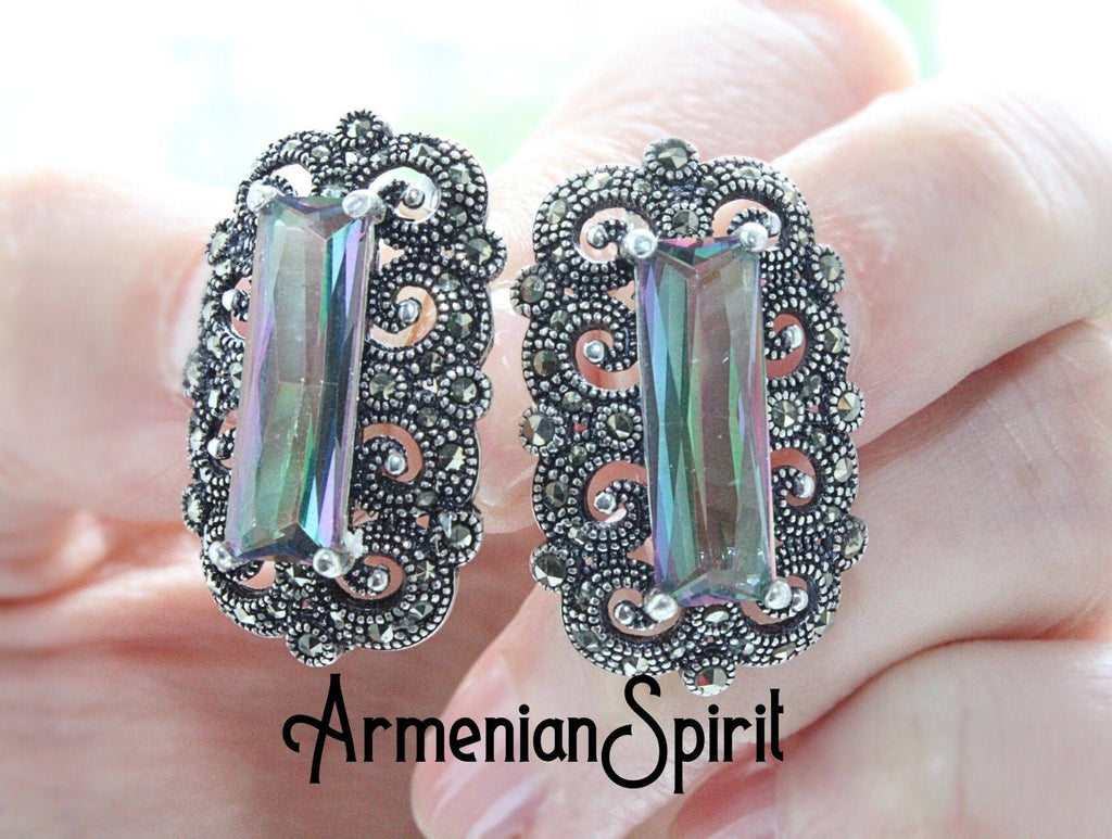 Explore the beauty of Armenian culture with our STERLING 925 jewelry collection! These exquisite earrings feature a mesmerizing green nacreous stone and exquisite Marcasite detailing. Perfect for a tudor-inspired outfit or a touch of retro glamour, these earrings are perfect for any special occasion.