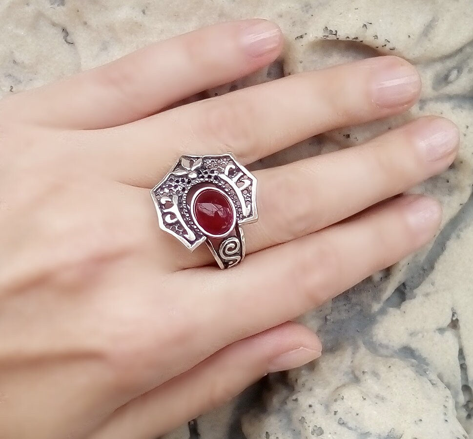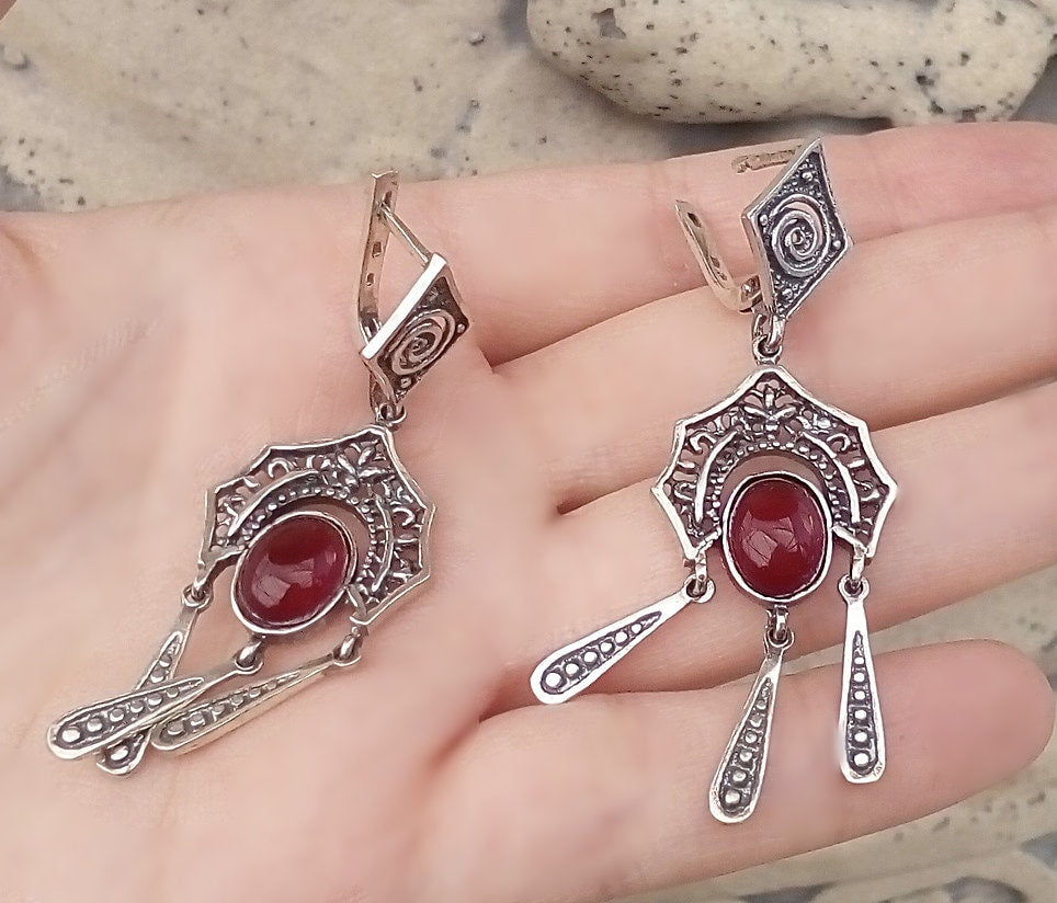 Discover the beauty of Armenian jewelry with our high-quality Garnet gemstone dangle earrings. Handcrafted Taraz designs inspired by Western Armenian Vaspurakan and Van ornaments. Shine with bohemian style and elegance, all made with genuine SILVER 925.