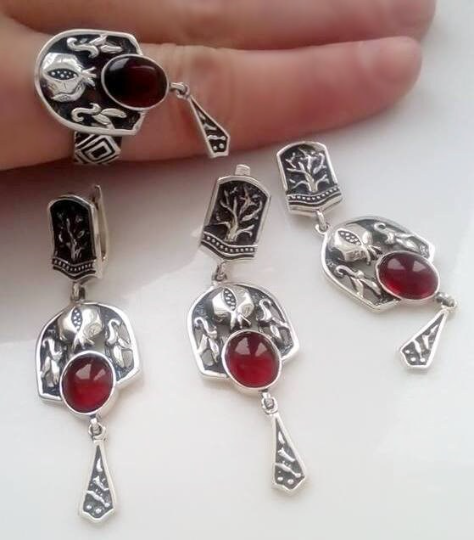 If you are searching for a gift for wife or mother, then these earrings are the best option. These beautiful earrings are made of sterling silver 925 and garnet cabochon stone. The earrings are dangle with English lock and small pomegranate in front. Pomegranates have diverse cultural and religious significance, as a symbol of life and fertility owing to their many seeds but also as a symbol of power. In Armenian and Jewish culture the pomegranate is a symbol of prosperity and a new family. The Pomegranate is also is a symbol of Goddess of Underworld - Persephone.