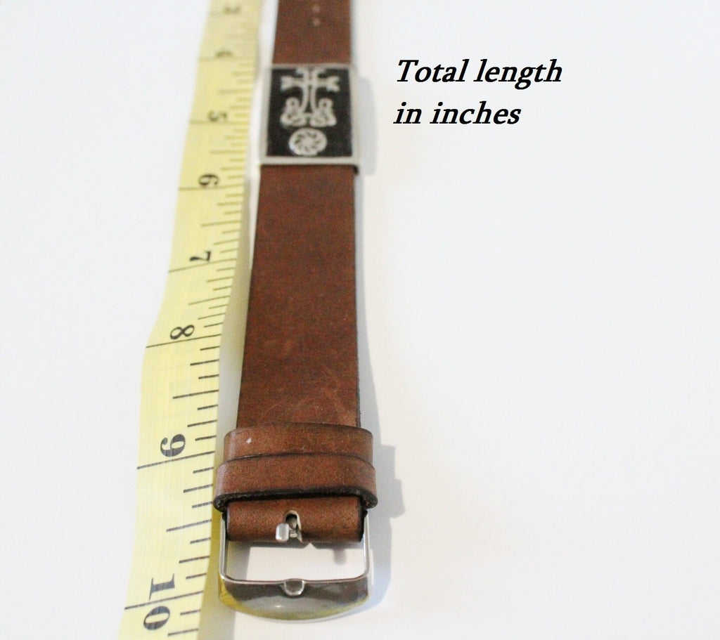 Does your man love leather bracelets with silver crosses? Check out this bracelet with brown genuine leather and rectangular Armenian cross in khachkar style. The bracelet also adorns the pattern with the Armenian sign of eternity arevakhach. The plate with the cross is made of 925 sterling silver. The bracelet will be a wonderful and welcome gift for a man of any age. The bracelet itself can be made exactly according to the size of the wrist. Please note that the lock is not made of silver. The store has a variety of similar leather bracelets for men in black leather, green leather and brown leather with a silver cross.