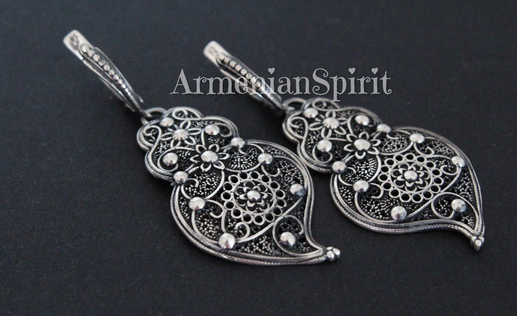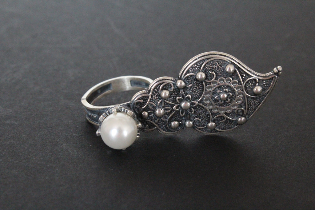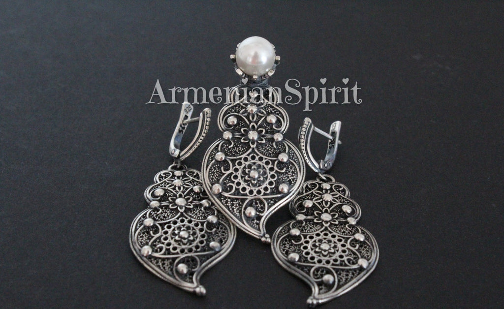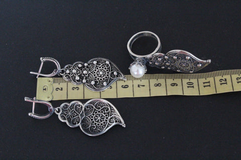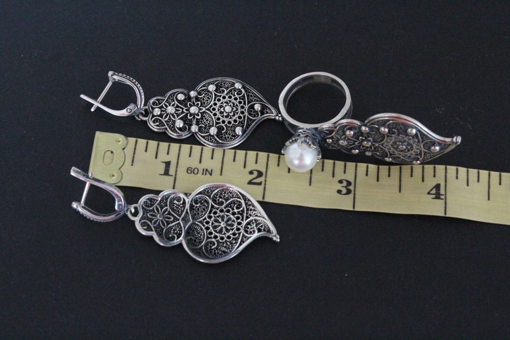 Armenian jewelry Large Earrings and ring lab pearl Sterling silver 925 Unusual Artisan jewels Ethnic pattern