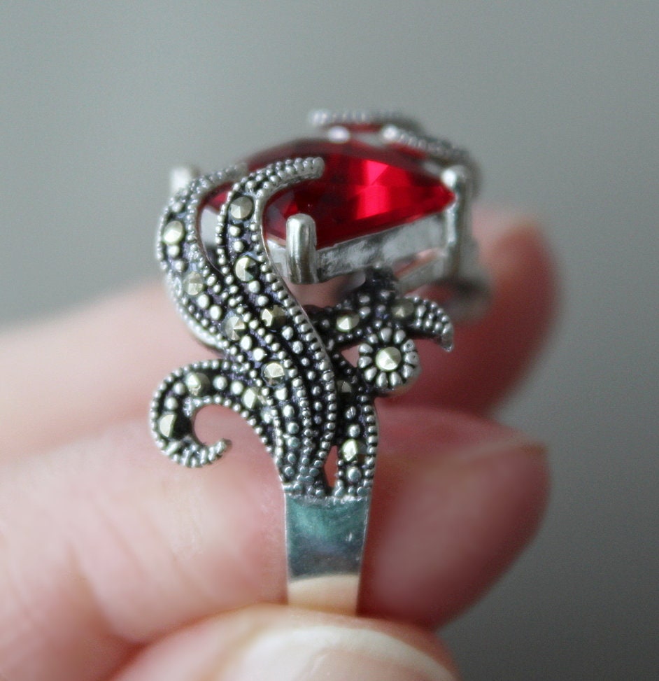 Indulge in the timeless elegance and luxurious quality of our Armenian Red Marcasite Ring. Perfect for Tudor, Victorian, and Renaissance styles, this handcrafted STERLING SILVER 925 ring adds the perfect touch of sophistication to any outfit. Elevate your engagement or wedding look with this stunning red accessory.