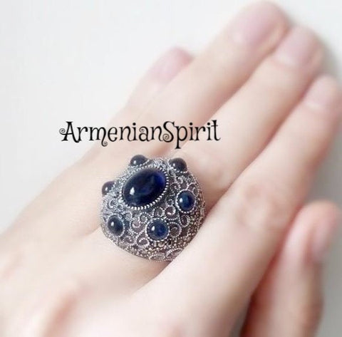 Incredibly beautiful ring, a work of art in the field of jewelry. The ring is made of 925 sterling silver in the shape of a dome with filigree patterns. On the ring, blue stones of artificial quartz are symmetrically located. This ring is perfect for parties and special occasions. This ring can also be worn with blue office formal wear.