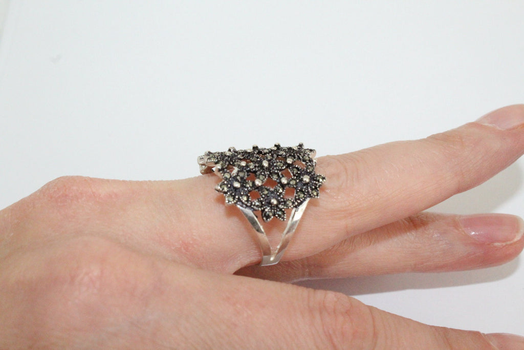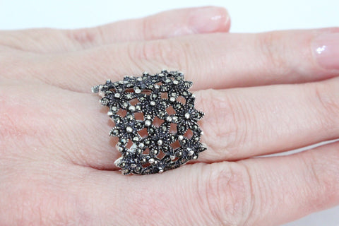 Upgrade your jewelry collection with this stunning Armenian jewelry set from Armenian Spirit. Made with high-quality sterling silver (925), this set includes dangle earrings and a finger cover ring featuring delicate floral designs embellished with marcasite. Elevate your style with these small but elegant pieces.